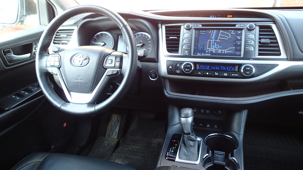 Здесь трудно промахнуться мимо какого-либо прибора, кнопки или другого элемента управления из-за их американских размеров. В средней части центральной консоли красуется интерактивный дисплей медиасистемы Toyota Touch 2, который хотя и не спешит мгновенно реагировать на прикосновение, но радует глаз качественной графикой. Ниже расположен блок климат-контроля с явно перегруженным узким монохромным экраном, а под ним в добрую половину ширины торпедо растянута полка для мелких вещей.