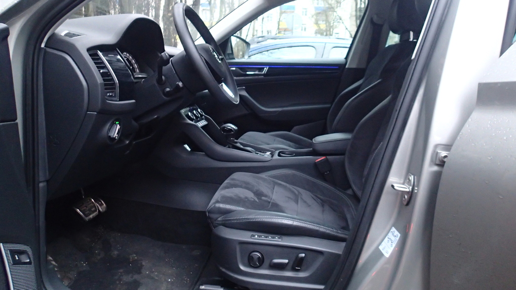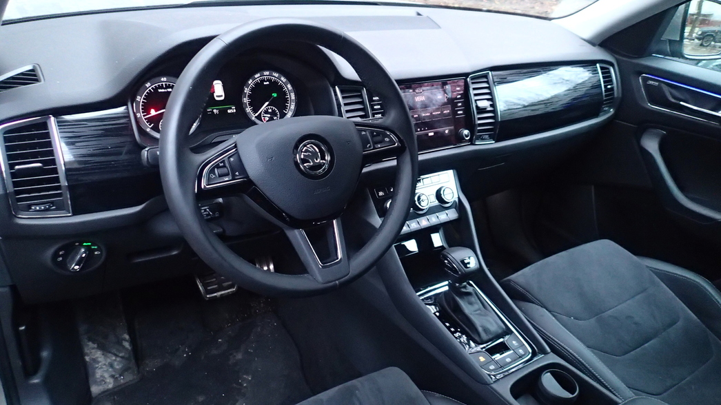 Морозным зимним утром здесь легко согреться в теплых объятиях водительского трона с широкой длинной подушкой и деликатной боковой поддержкой на спинке. Сидеть в Kodiaq удобно и уютно, обогрев руля и кресел «раскочегаривается» быстро.