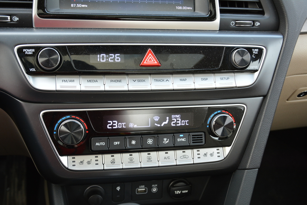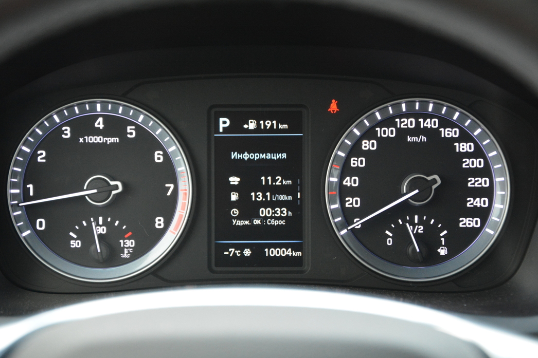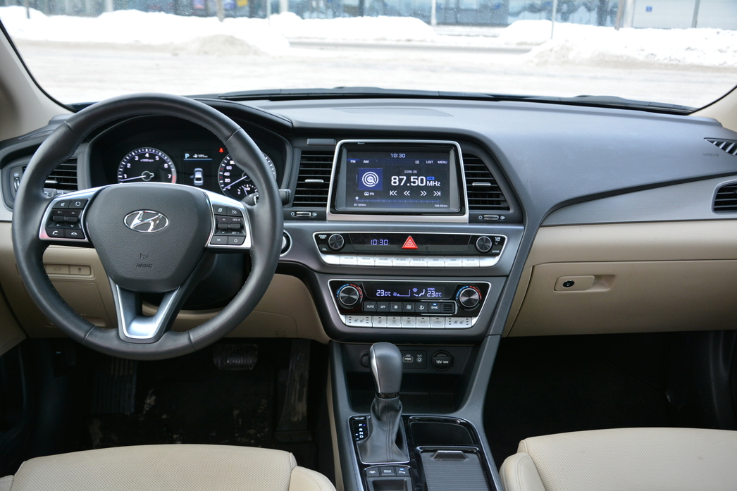 Оглядевшись в салоне Sonata, почти сразу понимаешь, что попал за руль машины для американского рынка. Это ощущение сложно выразить в формальных показателях. Но оно есть и никуда от него не деться. Замечу, что это не минус, а просто такая вот специфика модели. «Американизм» в полной мере ощущается, когда видишь эту аскетичную — хотя и с мониторчиком борткомпьютера между циферблатами спидометра и тахометра, — панель приборов, эти «алюминиевые» клавиши включения обогревов всего и вся под блоком управления климатом, эту черно-белую цветовую гамму отделки салона…