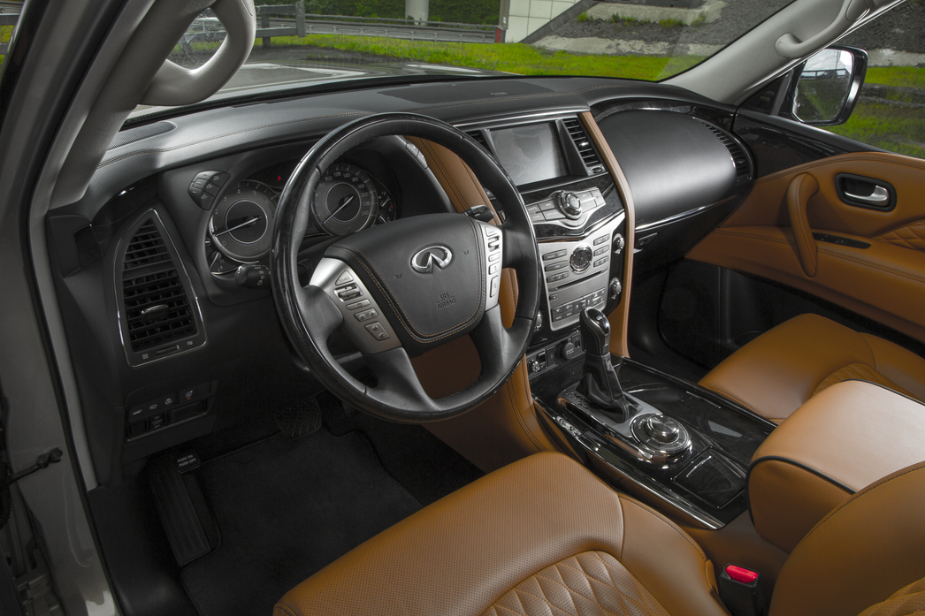 Места в салоне Infiniti QX80 столько, что можно играть в гольф. Причем обитатели галерки пространством нисколечко не обделены — мозоли на коленях о спинки впереди стоящих сидений они не натрут. А как же тут стало тихо — благодать! Дополнительные звукоизолирующие материалы в полу, арках, багажном и моторном отсеках свое дело сделали.