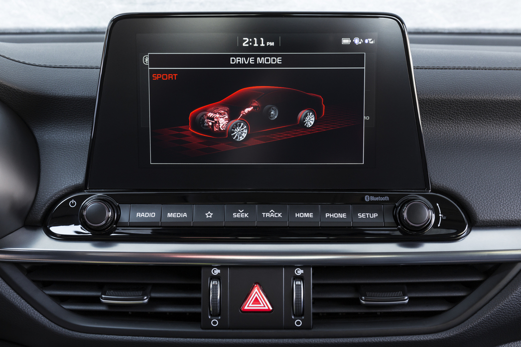 Кстати сказать, подобные дизайнерские решения позволили снизить коэффициент аэродинамического сопротивления седана до впечатляющей цифры 0,27. А агрессию броска этому механическому зверю сообщают полностью светодиодная передняя оптика (глаза зверя) и плотоядная улыбка решетки обдува радиатора (пасть зверя). А в целом автомобиль вышел весьма харизматичным и даже, возможно, авангардистским: в лучших, короче говоря, традициях и стилистике флагманской модели KIA — фастбэка класса «гран турзимо» Stinger. И если брать машину в «боевой» красной расцветке (в гамме, кстати сказать, появился новый волнующий колер Runway Red, рекомендуем), внимание соседей по потоку и даже безлошадных участников дорожного движения обоих полов вам гарантировано.