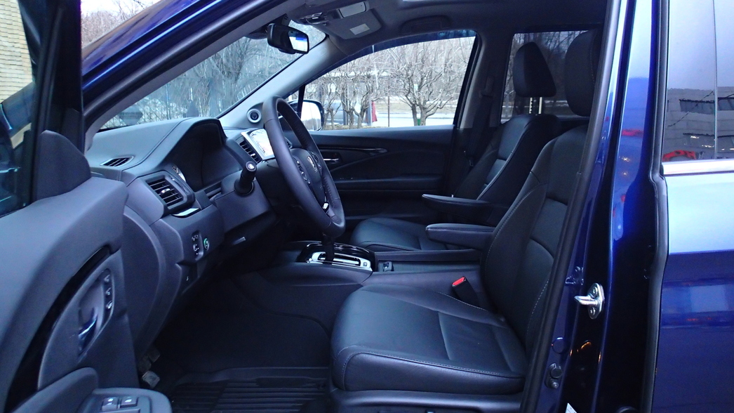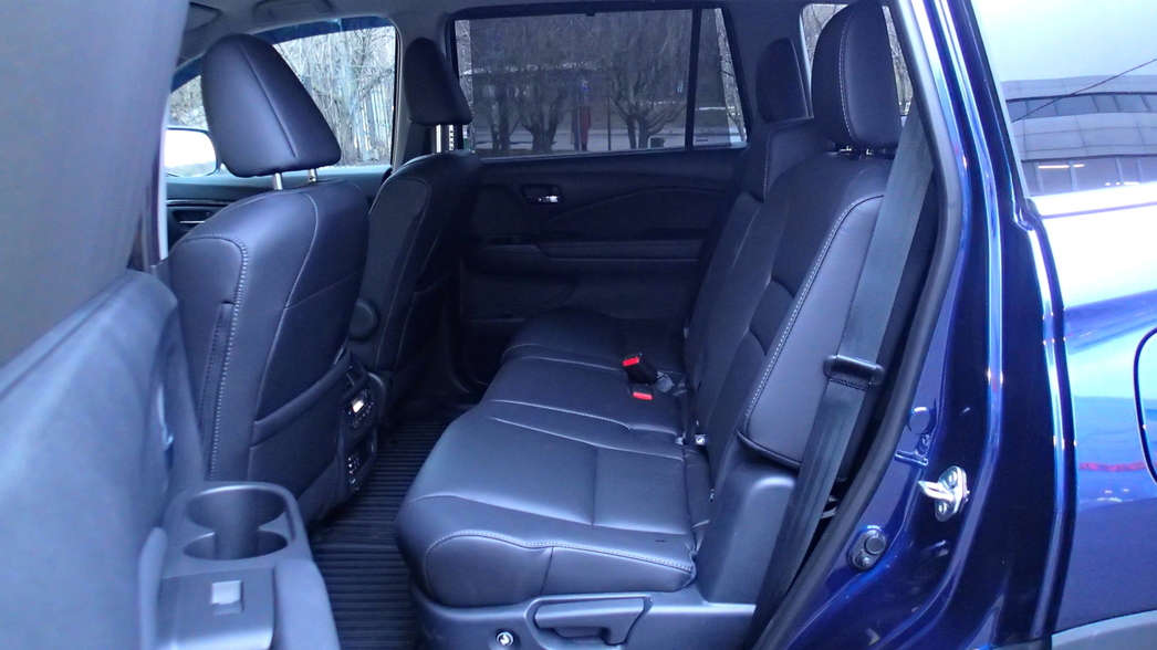 «Пилот» отличается продуманной трансформацией салона. Спинка второго ряда легко сдвигается вперед с помощью кнопки в торце подушки. Таким образом освобождается беспрепятственный проход на третий ряд с тремя сидениями, который на удивление гостеприимен даже рослым людям.