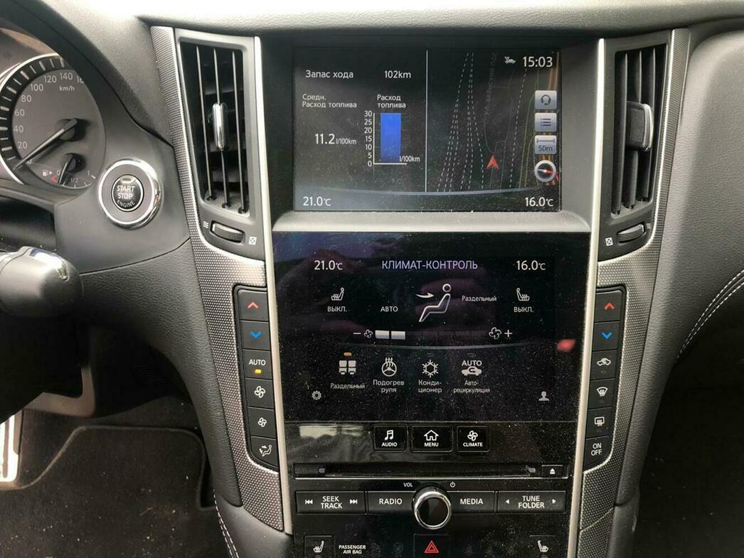 В салоне Infiniti сразу два сенсорных монитора, плюс поворотная шайба. На верхний можно вывести, скажем, карту навигации. На нижнем настроить климат. Иконки меню перетаскиваются с места на место, как в смартфоне. А медиафайлы можно упорядочить по исполнителю, жанру или другим данным. Кстати, для консервативных водителей, чтобы регулировать настройки температуры, предусмотрены и обычные клавиши.