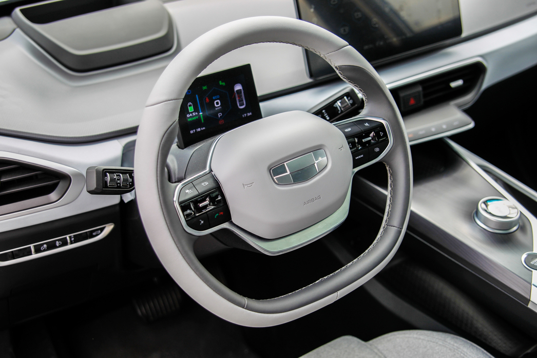 Так что ездовым повадкам «Геометрии» — однозначный «лайк». И салону — тоже: дизайн, материалы, эргономика очень хороши… Но не безупречны. Как только начинаешь приглядываться, то тут, то там вылезают мелкие огрехи. Скажем, сенсорные клавиши на центральной консоли становятся абсолютно невидимыми при ярком солнце. А крошечному экранчику панели приборов, в отличие от огромного центрального тачскрина, недостает солидности.
