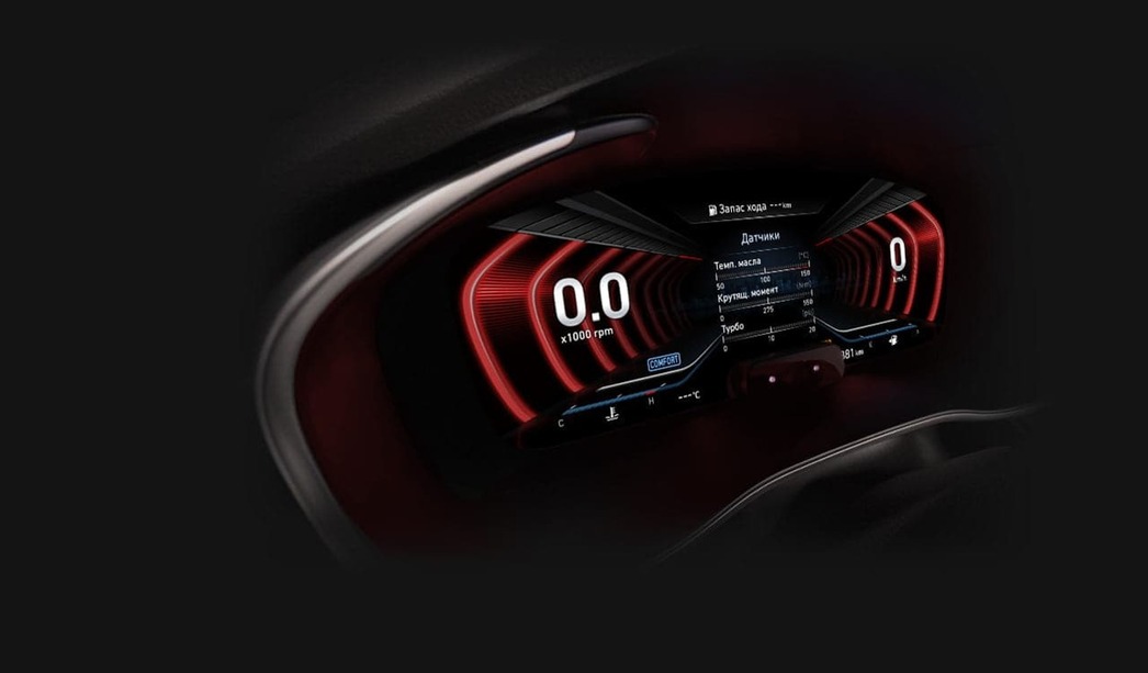 Новая приборная панель, доступная в базовом оснащении топовых комплектаций Supreme и Sport — это 12,3-дюймовый экран, который занял всю отведенную под приборку площадь. Главная фишка — 3D изображение, которое можно разглядеть невооруженным глазом. Ты смотришь на щиток и восхищаешься интересными спецэффектами и разнообразием дизайна. А панель своим оком (да-да, такое у нее есть) смотрит на тебя, улавливая направление взгляда, для того, чтобы показанная картинка выглядела максимально круто.