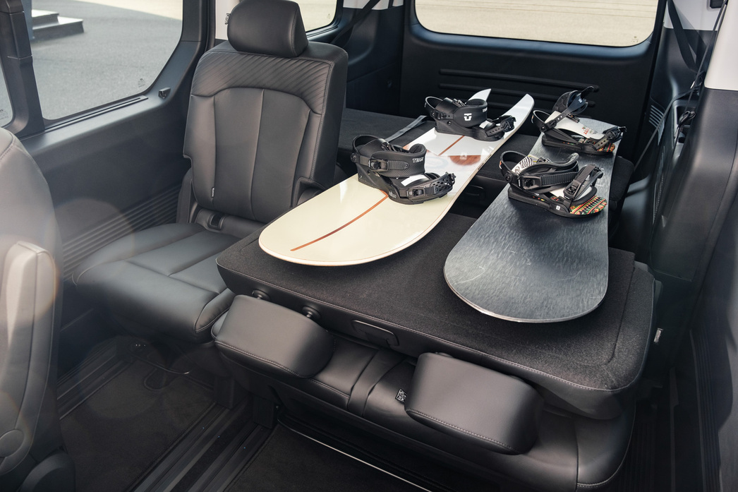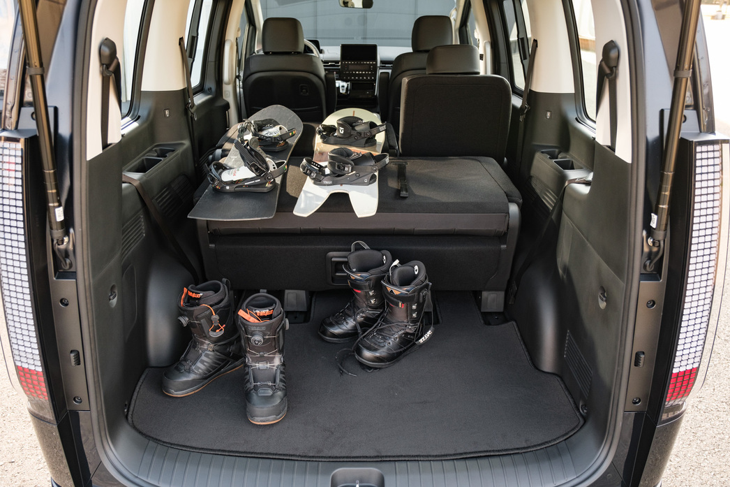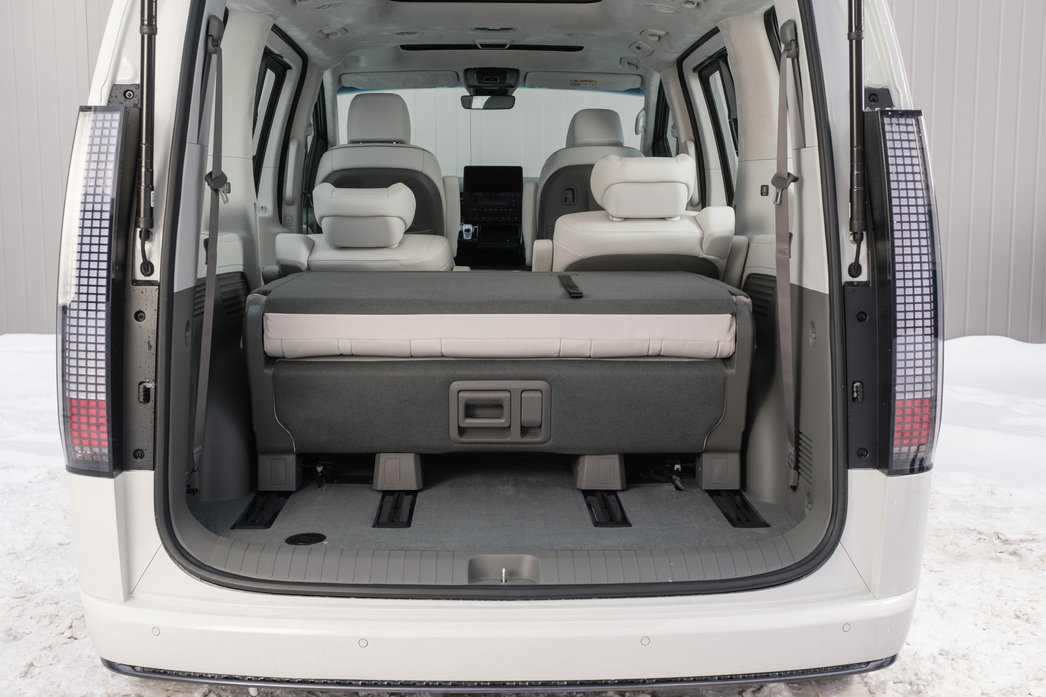 Staria по количеству вариантиов трансформации оказывается не хуже. Конечно, в 8-местном варианте багажника хватает только, чтобы положить туда пару небольших сумок, зато у второго и третьего рядов есть салазки, с помощью которых сиденья двигаются на 160 и 300 мм соответственно. Все спинки складываются, так что получается ровная площадка, которую можно превратить, скажем, в полноценное спальное место.