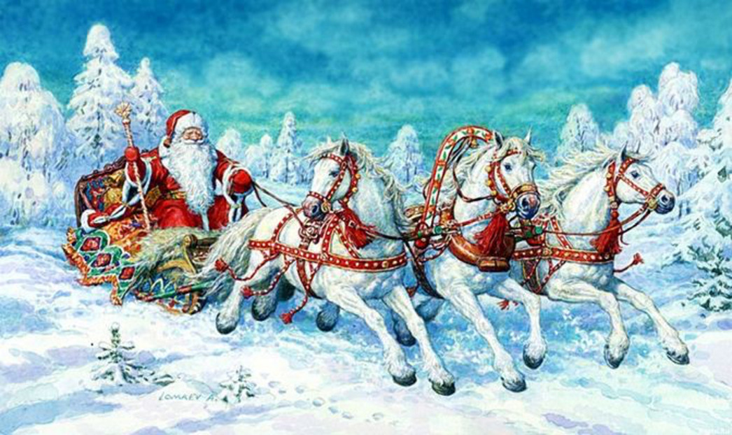 Он передвигается достаточно скромно, очевидно из-за специфики нашей дорожной сети. Его сани тянет за собой тройка коней, которым в некоторых источниках дают имена зимних месяцев — Декабрь, Январь и Февраль. Кстати, в тройку запрягаются орловские рысаки. Масса одного коня — 550 килограммов. А их ведь три. Значит получаем 1650 килограммов неукротимой мощи и красоты. При этом сбруя коней богато украшена колокольчиками и бубенцами, которые впоследствии оказались прообразом современных сирен. С Санта Клаусом все несколько по-другому.