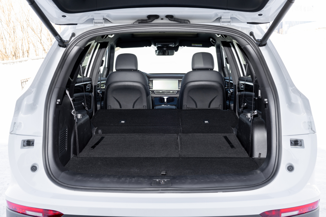 Чисто внешне кроссовер произвел впечатление. Массивный, с тисненым в 3D-манере богатым грилем. 20-е колеса, автоматическая светодиодная оптика с поворотной линзой, панорамная крыша, прикрытые дверями пороги и заводская тонировка задних стекол.