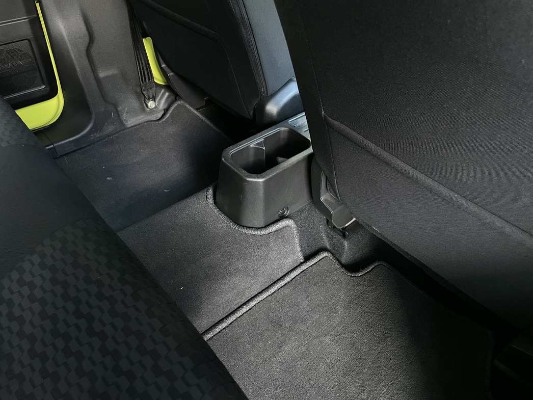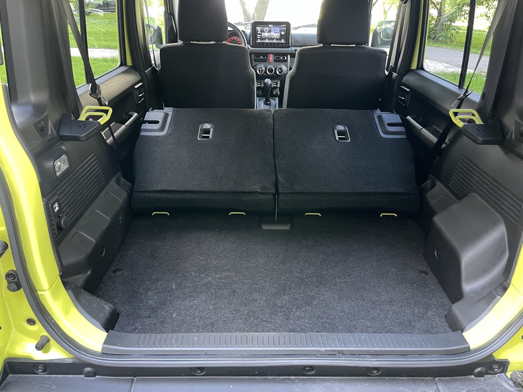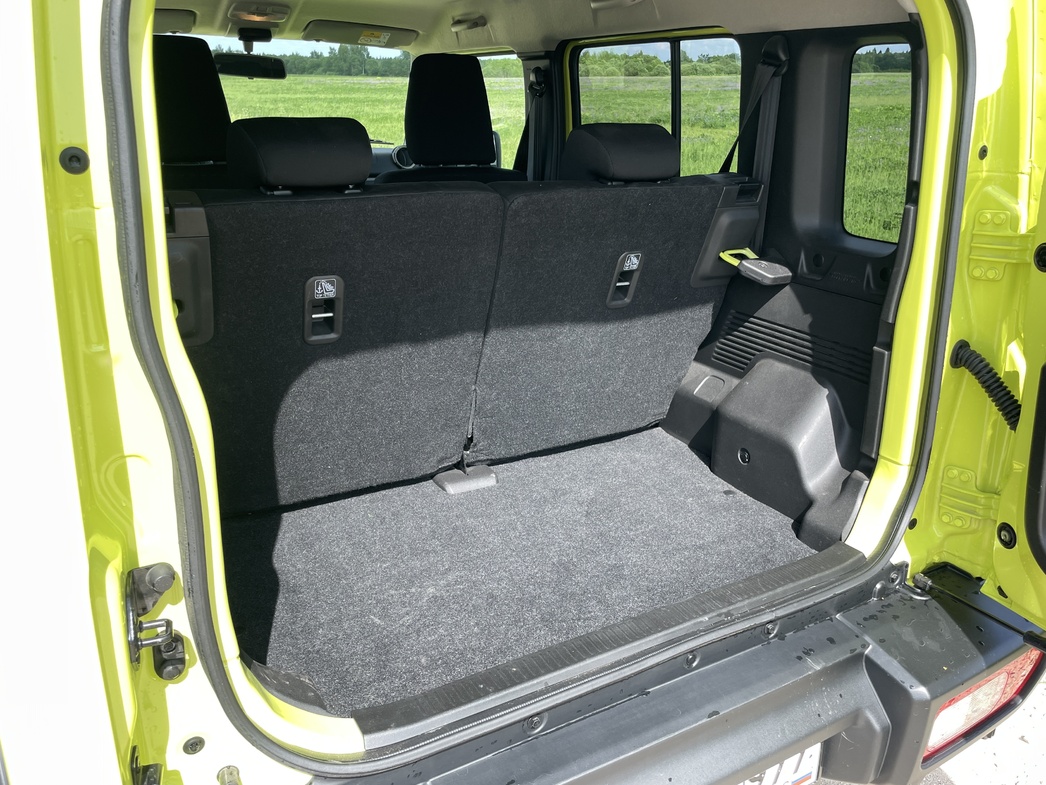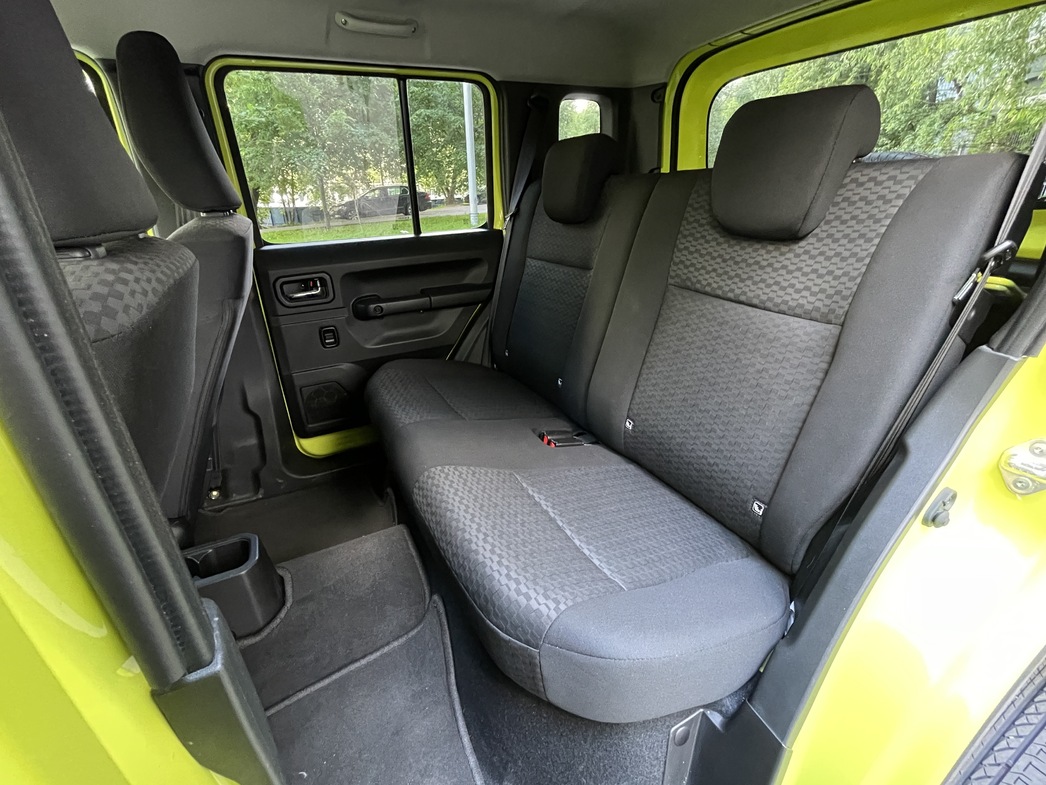 Двоим даже крупным седокам, разместившимся на диване, в «Джимнике» будет комфортно, но скучно. С водителем, не сорвав голос, не поболтаешь (помните про шумоизоляцию, да?), USB-портов для «подпитки» гаджетов в дальней дороге у них нет. Как нет собственных подстаканников и дефлекторов климатической системы. Зато — раз уж заговорили о заднем ряду — механизм складывания спинок, если нужно увеличить объем багажника, предельно прост и не требует физической силы: с этой миссией справится не то что хрупкая девушка, а первоклассник.