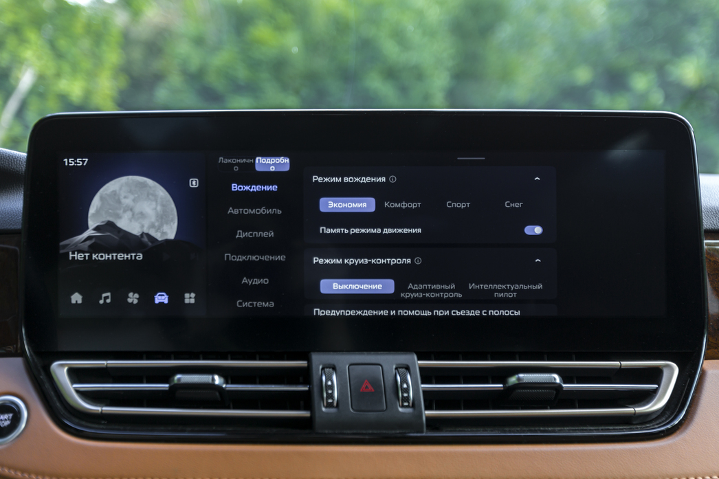 Насладиться огромным и достаточно качественным «телевизором» мультимедийной системы в полной мере, увы, не удалось: ни Apple CarPlay, ни Android Auto она не знает, так что крошечный уголок экрана — единственное, что работало на создание комфорта в огромном салоне. Остальная же часть осталась безразлично черной с мелкими и абсолютно бесполезными пиктограммами.