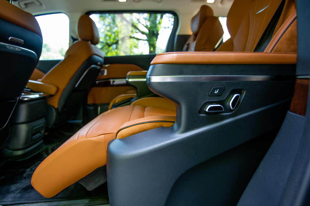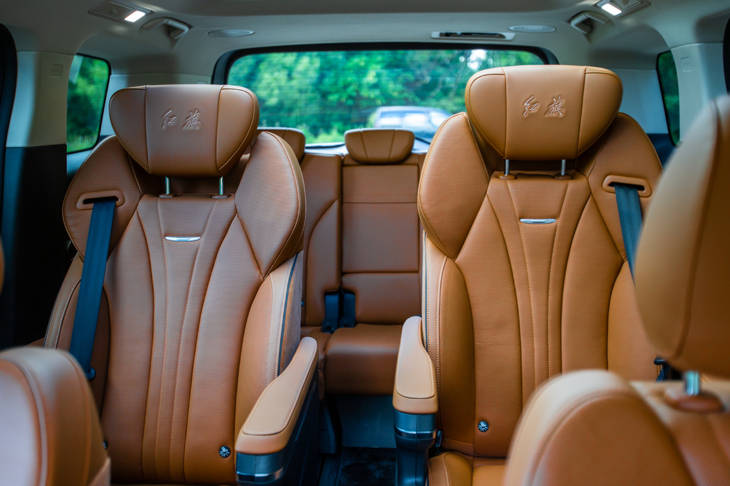 Hongqi HQ9 — машина для пассажира, так что рассказ о салоне стоит начинать именно со второго ряда, и тут есть о чем поговорить. Два роскошных капитанских кресла с оттоманками способны откинуться полностью, обеспечив комфортный сон — они невероятно бережны к своим «хозяевам» и символизируют достаток всем своим видом. В такой позе и московская пробка — не проблема, а возможность отдохнуть. Понравится и маме, и шефу.
