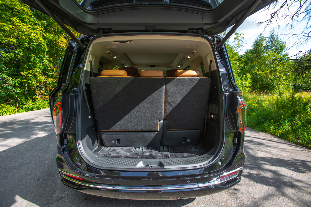 За «главным» местом в салоне расположен третий ряд, причем он вполне актуальный, вместительный и предполагает «постояльца» любой комплекции, если чуть сдвинуть вперед капитанское кресло. Странно, что делать это приходится вручную — статус автомобиля подразумевает электромотор. Однако же нет — тяните силой мышц.