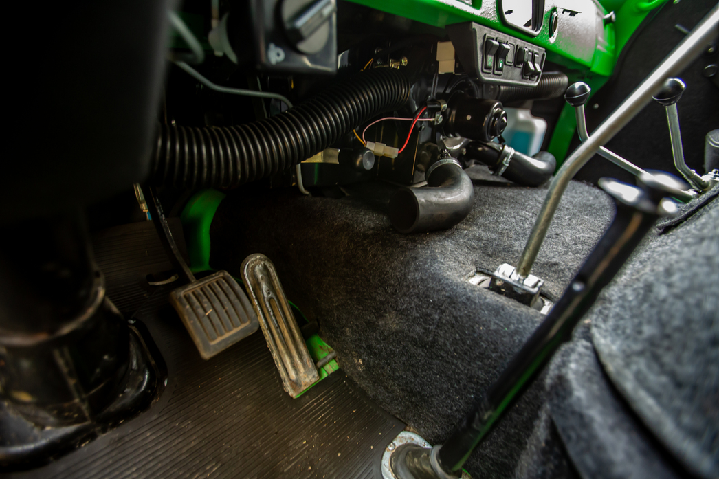 Небогатый, скажем вежливо, ассортимент приборов, представленный единственной шкалой в центре, немногословен, а торчащие патрубки печки не справляются с созданием «погоды в доме». Печек, кстати, тоже две: для пассажиров заднего ряда — отдельная. За спиной у водителя еще и полноценный стол, за которым можно и дичь разделать, и штабное совещание провести, и мотор, расположенный прямо между шофером и передним седоком, отремонтировать.