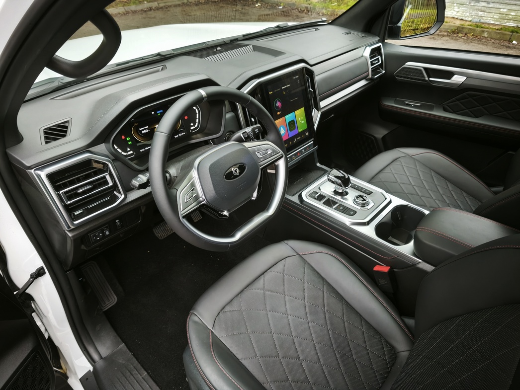 Ниже в консоли — отсек с индуктивной зарядкой, в широченном подлокотнике — охлаждаемый бокс. В общем — как будто бы нормальный семейный SUV, только с отдельным кузовом, который, кстати, можно прикрыть опционными герметичными крышками.