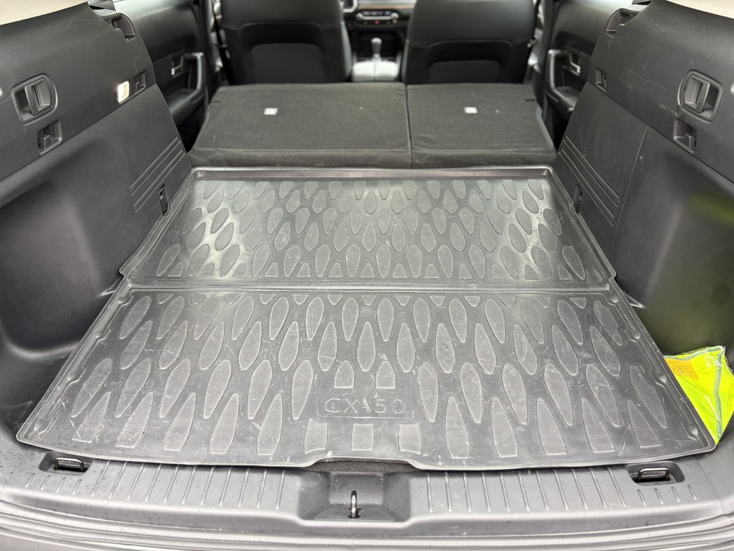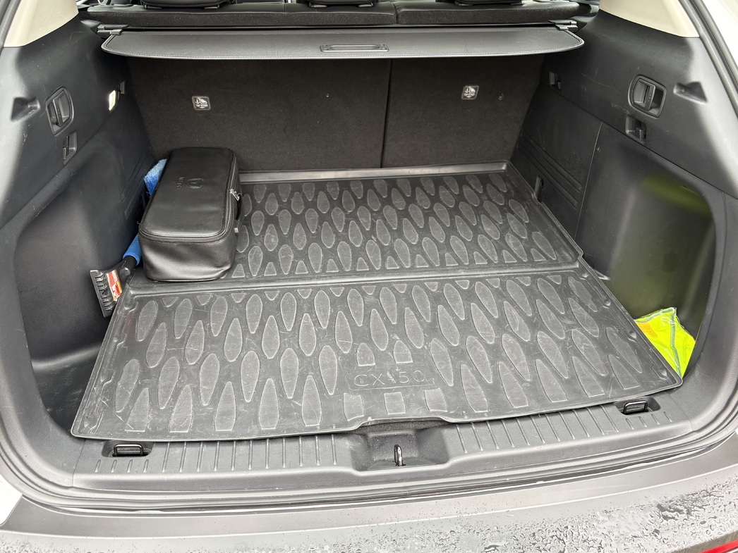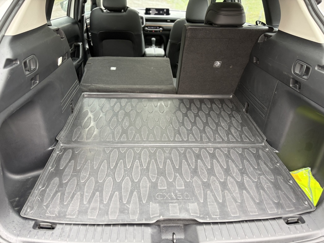 Багажник CX-50 — один из сильных аргументов в пользу модели. Паспортный объем — 878 л, а при сложенных спинках второго ряда — 1594 л, причем образуется почти ровная площадка. Погрузочная высота комфортная, ступеньки нет. По бортам расположены крючки и петли для крепления груза, две лампы подсветки, розетка на двенадцать вольт и вместительные ниши.