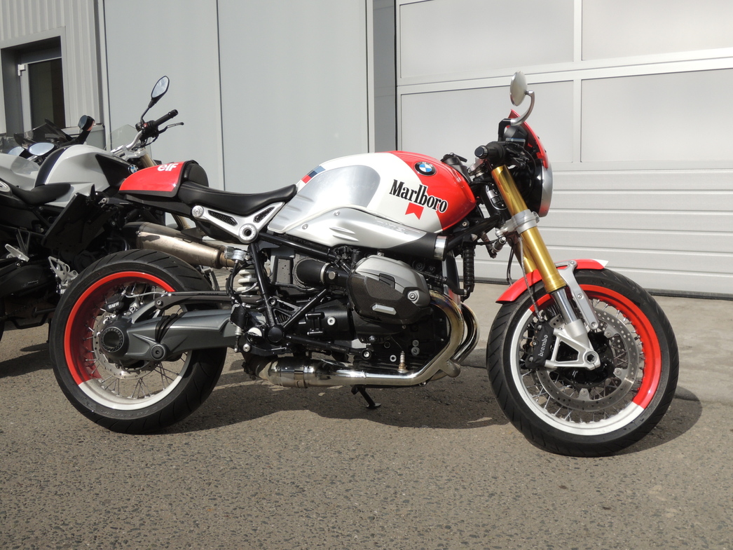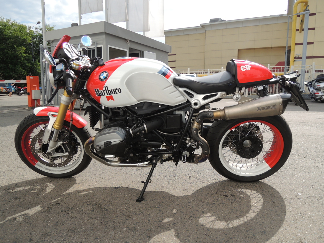 Переделок было много, так на мотоцикле появились новые клипоны и руль стал совсем низким. Подножки от известной фирмы Rizoma. Карбоновая защита цилиндров двигателя со слайдерами, защита выпускной системы, сам глушитель – от известной компании Akrapovic поднят вверх под самое седло, передняя крышка мотора стала блестящей, фара получила стильный козырек-обтекатель в стиле ретро. Также были установлены зеркала заднего вида в матовых стальных корпусах, ручки на руле и много чего еще по мелочи. Ну а самым главным козырем, превратившем этот байк в настоящий уличный «eye-stopper», является яркий красно-белый окрас в цвета гоночной команды BMW Marlboro Team, блиставшей на ралли «Париж-Даккар» в 80-е годы. В таком исполнении «девяностый» получился исключительно одноместным эгоистом-соло, зато под ярко-красной крышкой в месте для сиденья второго номера притаился... небольшой перчаточный ящичек, который легко можно использовать по прямому назначению. Вобщем, в итоге получился очень стильный и яркий мот, несомненно обращающий на себя внимание на дороге. Это вовсе неудивительно, особенно если учесть, что стоимость всех переделок едва ли не удвоила изначальную цену стандартной модели.