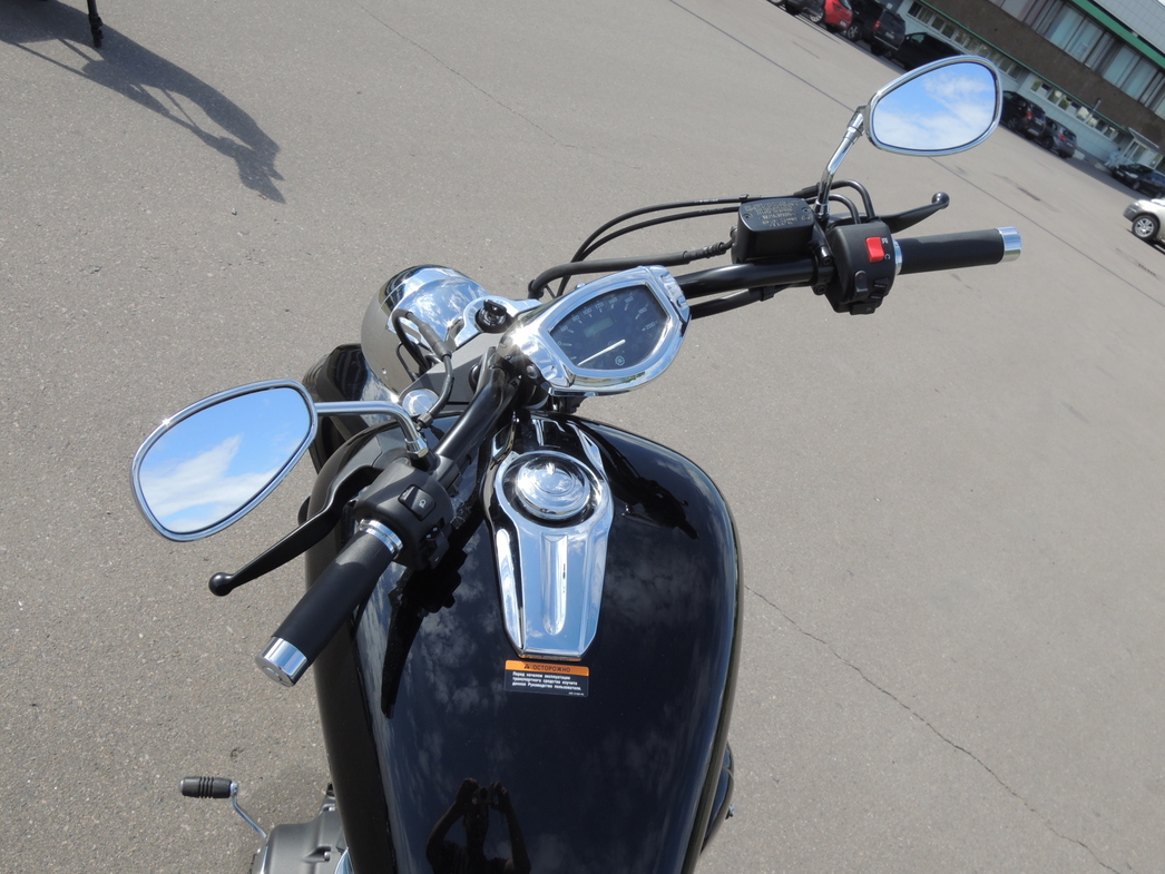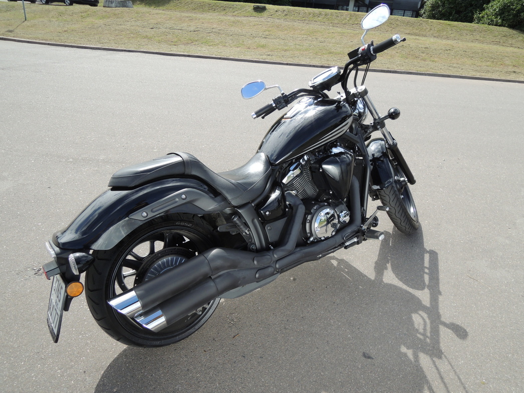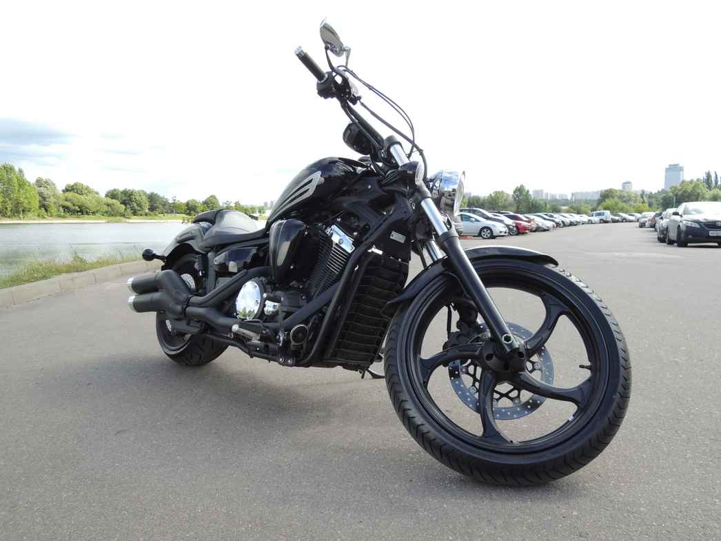 Новый круизер от Yamaha — это очень большой и тяжелый дорожный мотоцикл, внешним видом слегка напоминающий культовый американский бестселлер V-Rod. Тут все построено по классическим канонам жанра – огромный мотор V-Twin с практически автомобильным объемом 1304 «кубика» и жидкостным охлаждением, низкий центр тяжести, большое удобное седло, вилка, выступающая далеко вперед под большим наклоном, широкая задняя 210-миллиметровая покрышка, переднее колесо диаметром аж в 21 дюйм, длинное и низкое шасси, ручки руля отведены назад. Одним словом, выглядит мотоцикл весьма стильно и достойно, внимание на дороге явно привлекает. Тестовый экземпляр окрашен в цвет Midnight Black с матовым покрытием выхлопных труб, цилиндров двигателя и литых колесных дисков. Впрочем, если потенциальный покупатель пожелает быть более ярким и заметным на дороге, то можно выбрать у дилера и другой цвет – «Жидкую Медь» (Liquid Copper).
