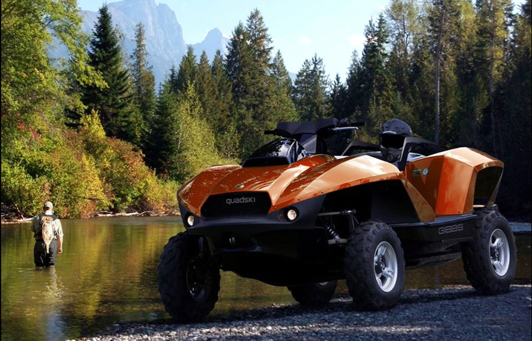 Детище американской компании Gibbs Sports Amphibians Inc под названием Quadski (в русской транскрипции звучит как «Квадски») оличется изящностью линий, идеальными пропорциями, инновационностью буквально каждой детали. Со стороны кажется, что все просто: взял гидроцикл, прилепил к нему колеса – и амфибия готоа. На самом же деле, появлению этого гибрида на свет предшествовали 15 долгих лет инженерных изысканий.