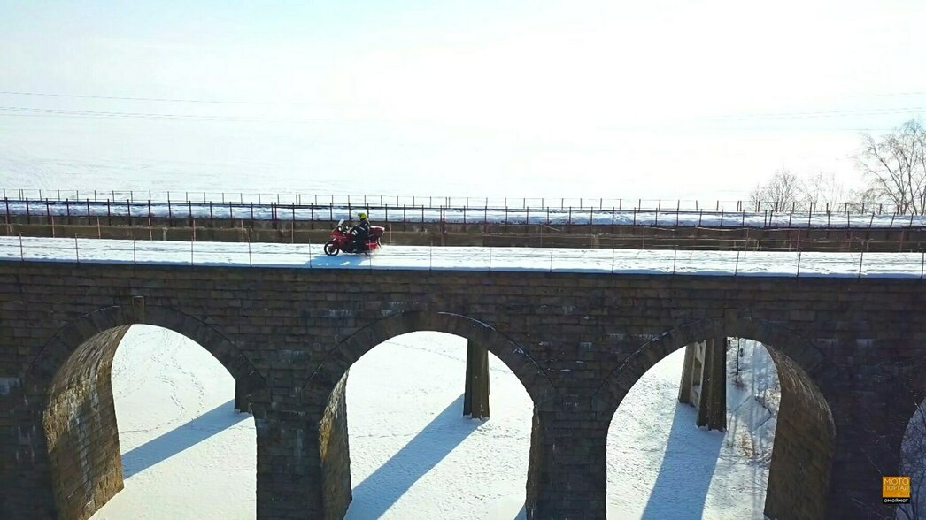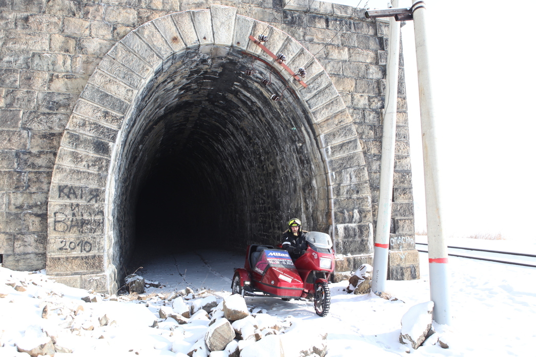 Кругобайкальская железная дорога не далась проще. И пусть обилие снега не стало большой проблемы для кроссовой зимней резины Mitas,в которую был обут мотоцикл, проблемы подкрались с другой стороны. Дело в том, что железная дорога, строившаяся в конце девятнадцатого века как однопутная, позже была расширена вторым путем, построенным параллельно первому. Со временем дореволюционный путь забросили, а редким поездам достался «новый» путь, в то время как старый, изобилующий тоннелями, мостами и эстакадами, фактически превратился в дорогу, доступную если не для автомобиля, то как минимум для мотоцикла с коляской.
