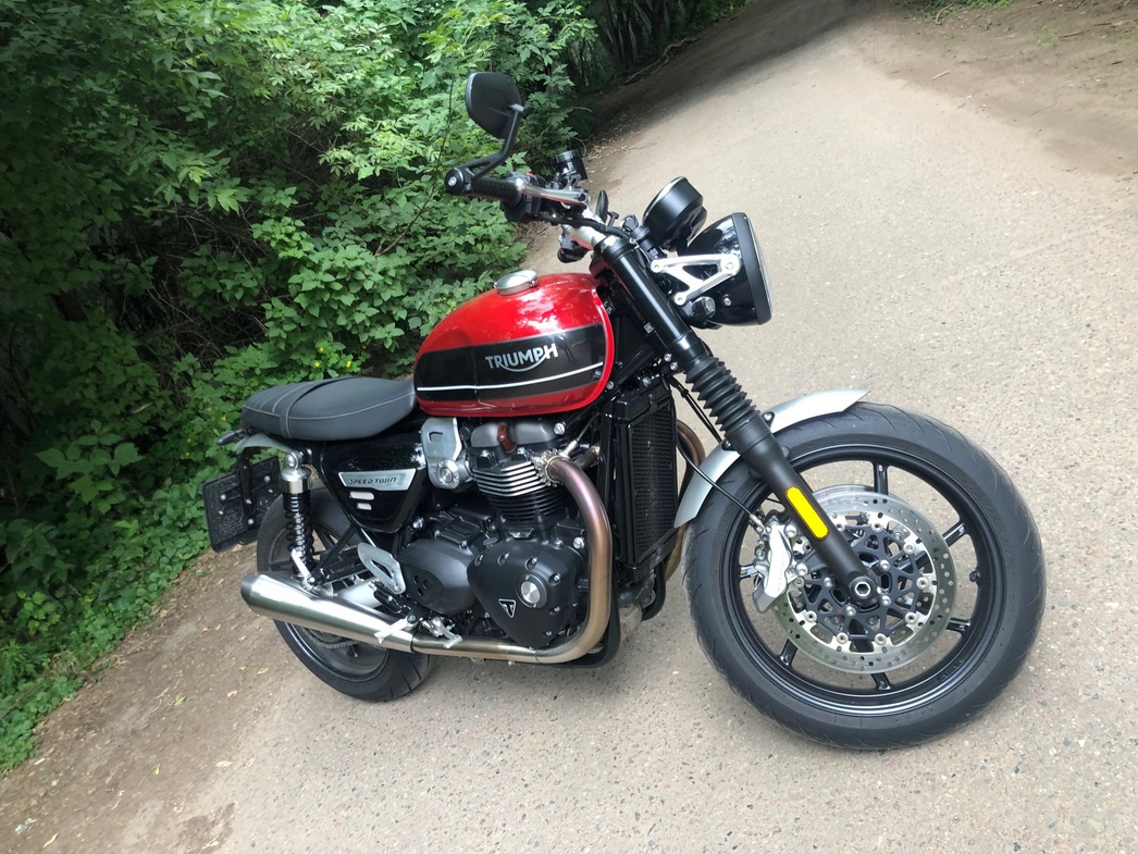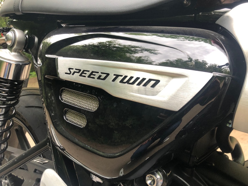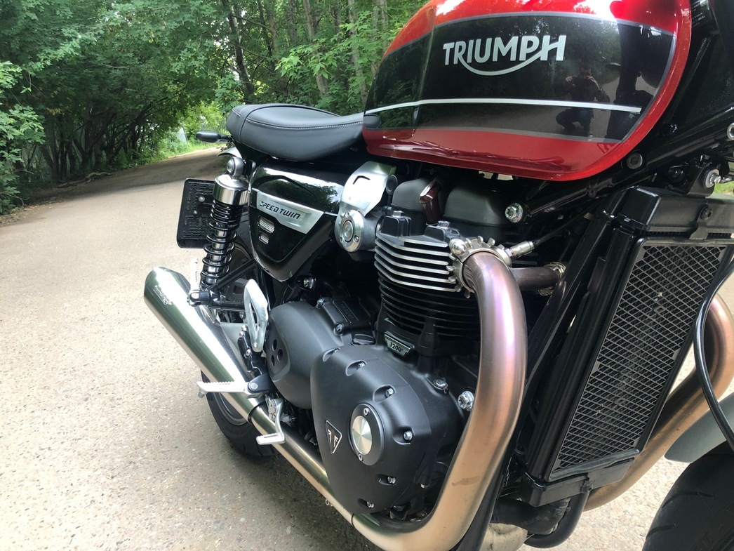 Дело в том, что, поизиционируемый компанией как заводской родстер, Speed Twin в нашем тестовом варианте оснащен мотором объемом 1200 см3 и мощностью почти 100 л. с. Вкупе с довольно длинными передачами, двигатель эластичен, и придает байку действительно ураганное ускорение. Эффекта добавляет установленный дилером выхлоп Vance&Hines, придающий мотоциклу солидный басовитый рокот.