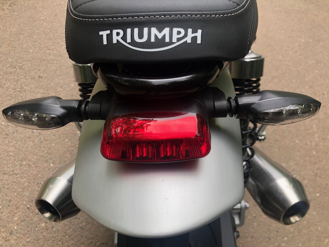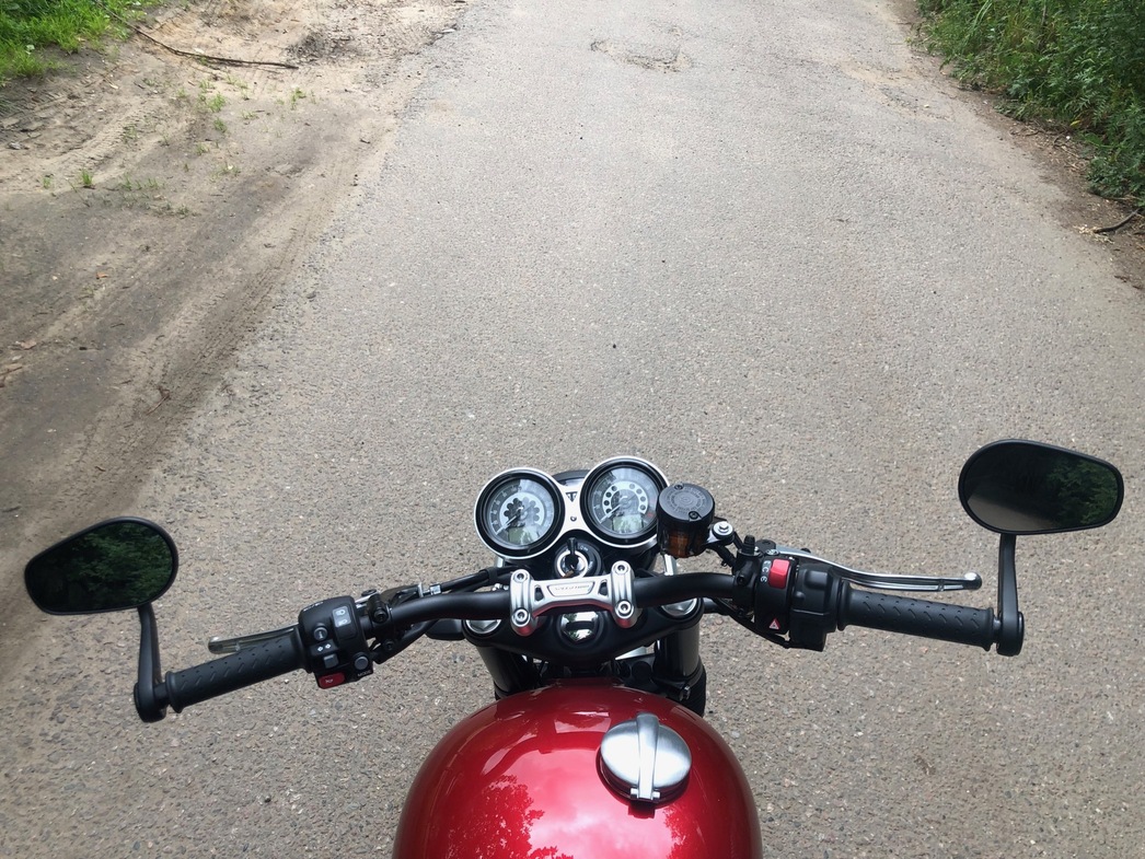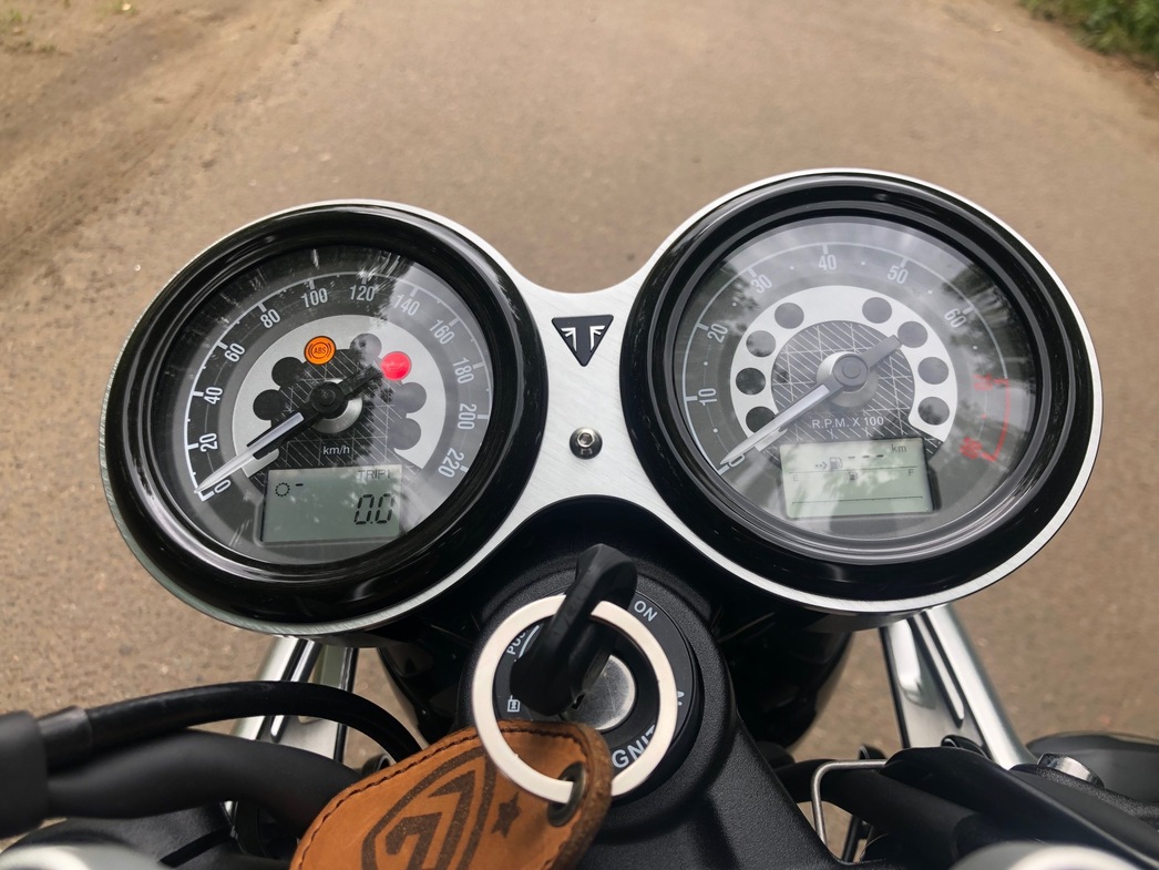 Надо сказать, что Triumph Speed Twin, имея в своем арсенале современный двигатель, коробку передач, подвеску и три режима электронной настройки двигателя — Rain, Road и Sport, сохраняет в себе классические олдскульные черты. Это и большие круглые аналоговые приборы, спидометр и тахометр, классические круглые зеркала, прямое словно лавка седло.