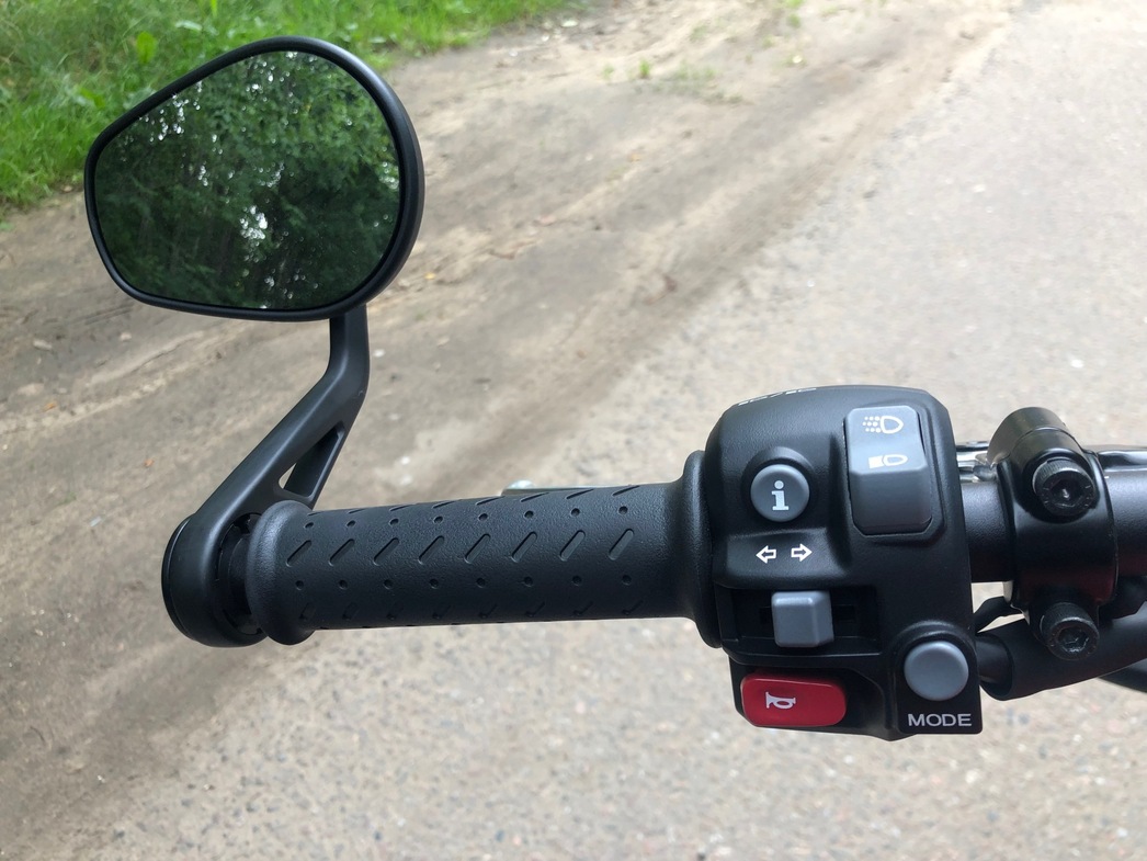 Круглые зеркала заднего вида стильно расположены на торцах руля и, помимо своей непосредственной функции, еще и определяют габариты мотоцикла — если между машин пролезли зеркала, то уж точно пройдет и весь мотик, ведь у Speed Twin больше нет никаких выступающих частей.