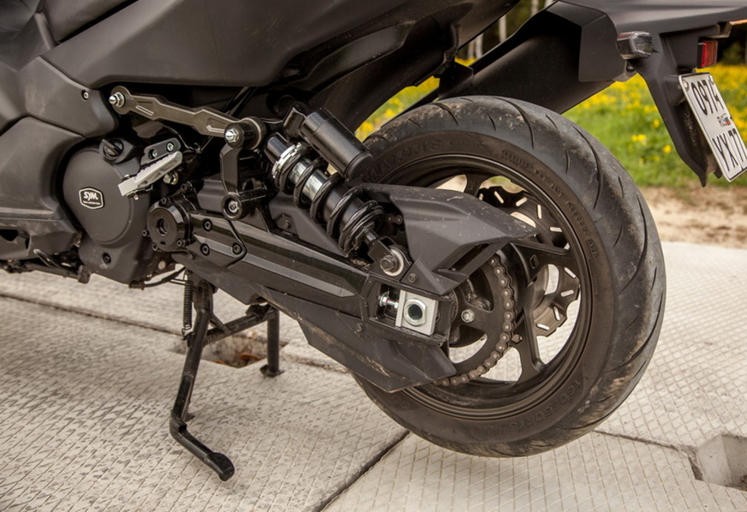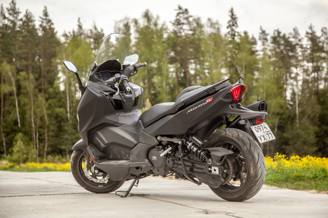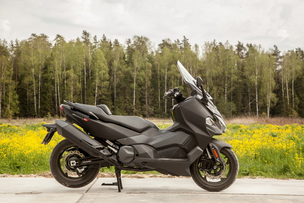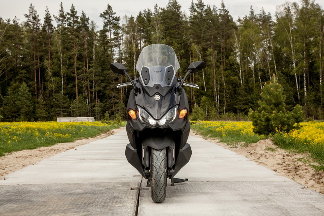 Ко всему прочему, центр тяжести «аппарата» сместился в самую нижнюю точку, что, в свою очередь, сделало его более устойчивым и управляемым. Вкупе с укороченной базой, односторонней маятниковой задней многорычажной подвеской с моноамортизатором, как у спортбайка, передней перевернутой вилкой с траверсой, идеальной развесовкой по осям в соотношении 50/50 и системой ABS, максискутер демонстрирует абсолютно спортивный характер в езде.
