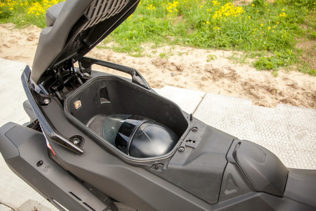 Впрочем, с функциональностью у TL 500 проблем нет от слова «совсем». Под сиденьем расположен вместительный бардачок, в который легко помещается как шлем, так и большие сумки из магазина. А для более мелких вещей в передней панели предусмотрены два бардачка размерами поменьше. В один можно сложить сигареты, зажигалку, ключи от дома или кошелек. В другой, поглубже, оснащенный USB-портом — смартфон. Впрочем, у маленьких бардачков есть один большой минус — их нельзя запереть.