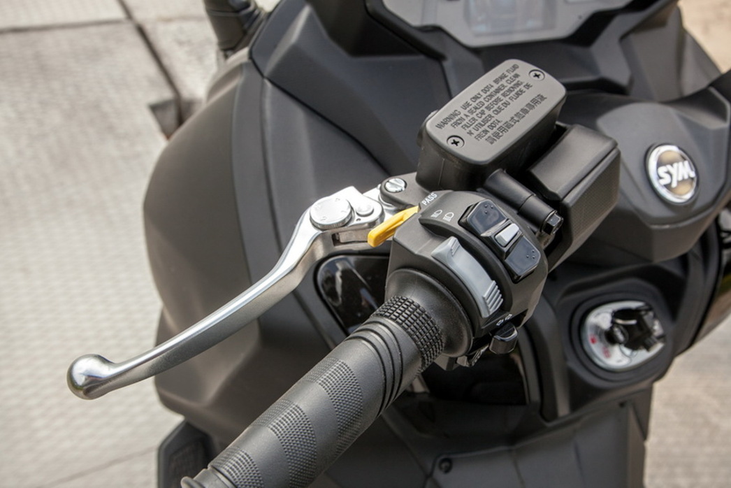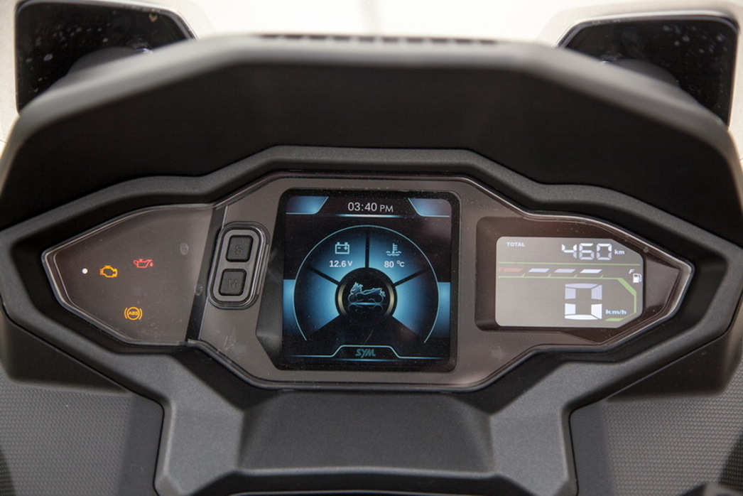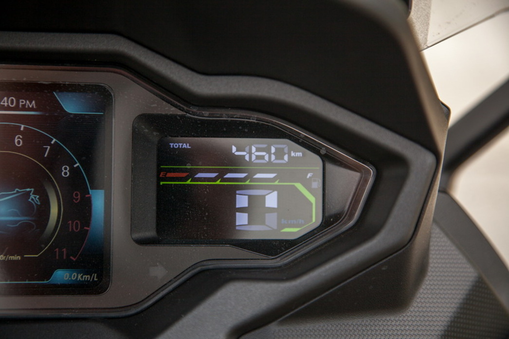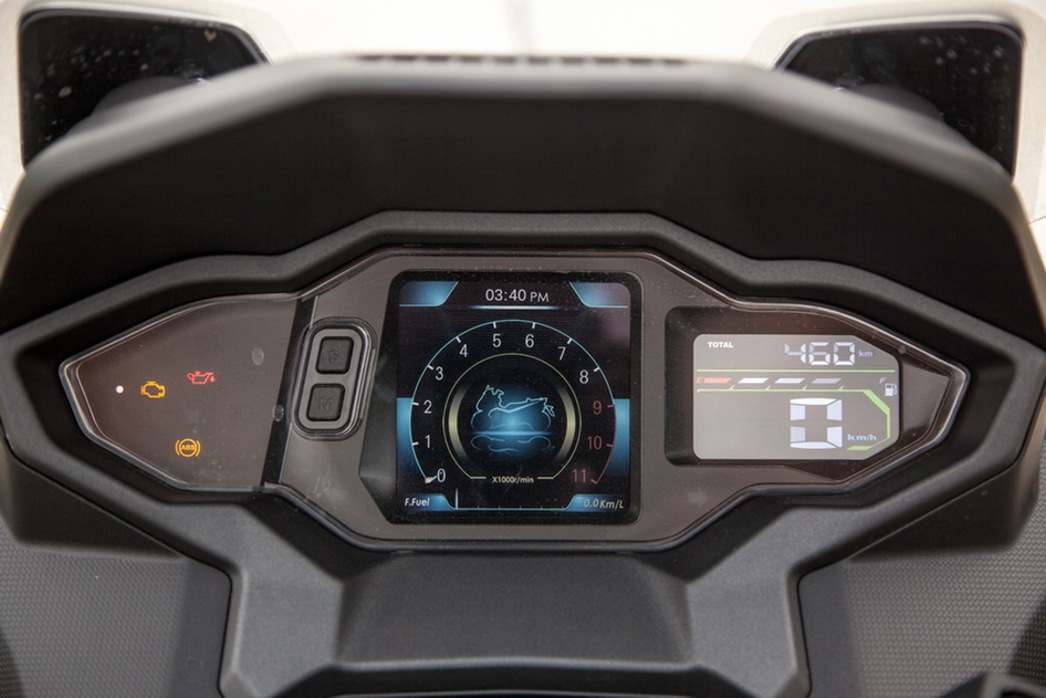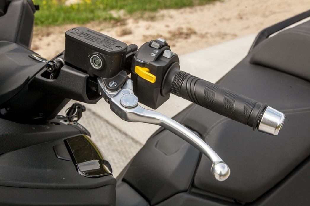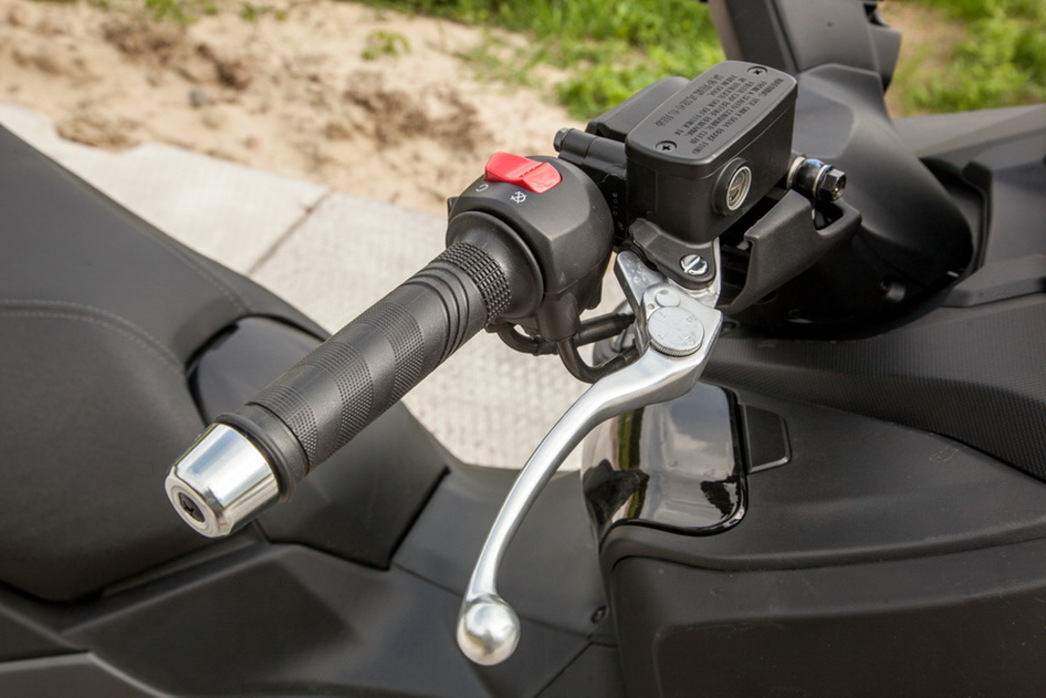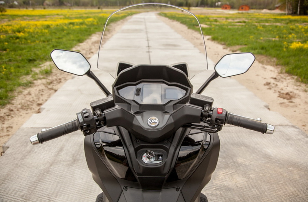 Если мы говорим о руле, то он имеет весьма приятный хват и расположен на расстоянии согнутой руки от седока — руки не затекают и не устают. Кнопки управления системами — в доступности большого пальца руки. А тормозные рукояти имеют регулировку «дальше-ближе». Есть и небольшой бонус на левой ручке — желтая кнопка, позволяющая поморгать дальним светом. А если посмотреть за руль, то можно увидеть, как в скутере отлично реализована цифровая приборная панель. Она не только не бликует на солнце, но и имеет различные комбинации дизайна и вывода информации.