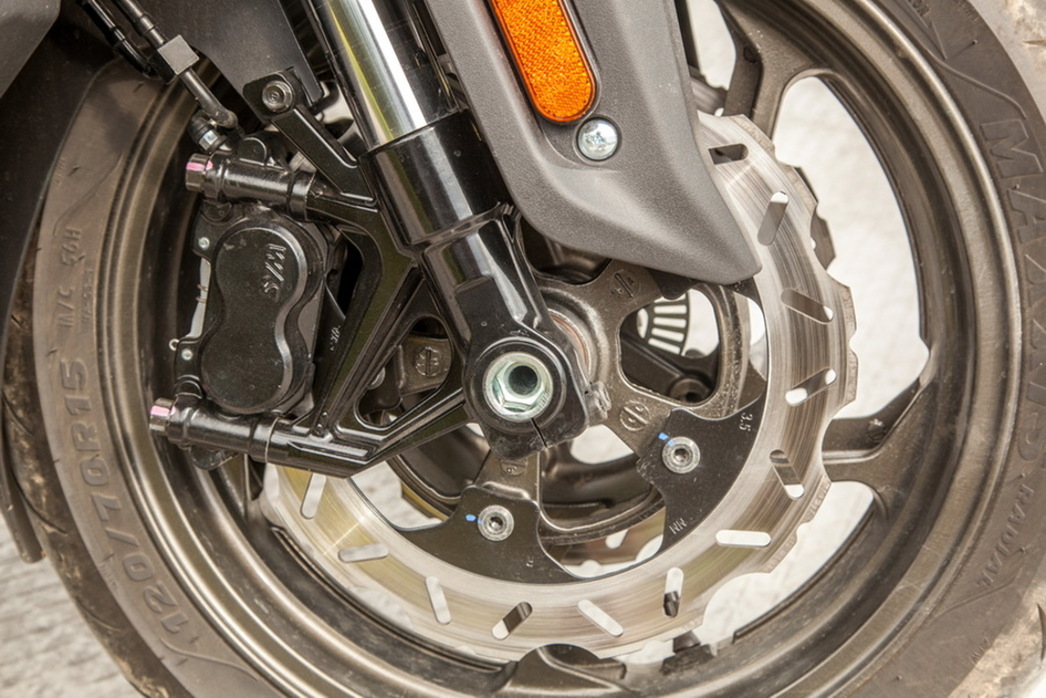 И при маневрировании в городском потоке, и на загородных извилистых дорожках TL 500 показал себя надежным и послушным в управлении. Под сброс газа он, слегка потупившись, охотно кренится на бок, и легко пускается по дуге. При этом 15-дюймовые покрышки довольно цепко держатся за покрытие, позволяя кренить скутер почти до касания пластиком асфальта.