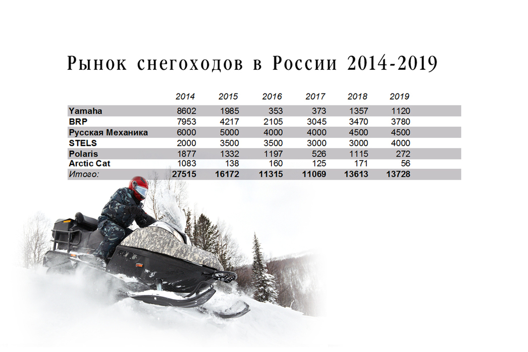 STELS, как мы видим по статистике за 2019 год (за 2020-й данных еще нет), чувствует себя вполне уверенно. Однако на рынке снегоходов его главный конкурент — компания «Русская Механика» — идет на полкорпуса впереди. Да и канадский BRP, несмотря на высокий ценник, не сильно отстает от ведущих игроков.