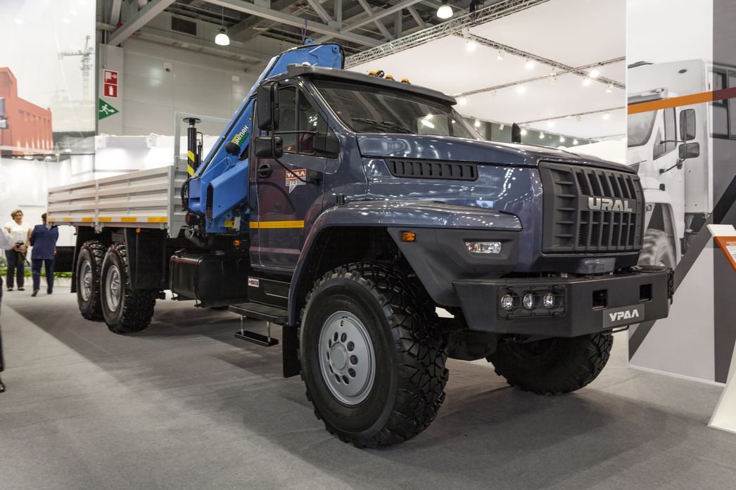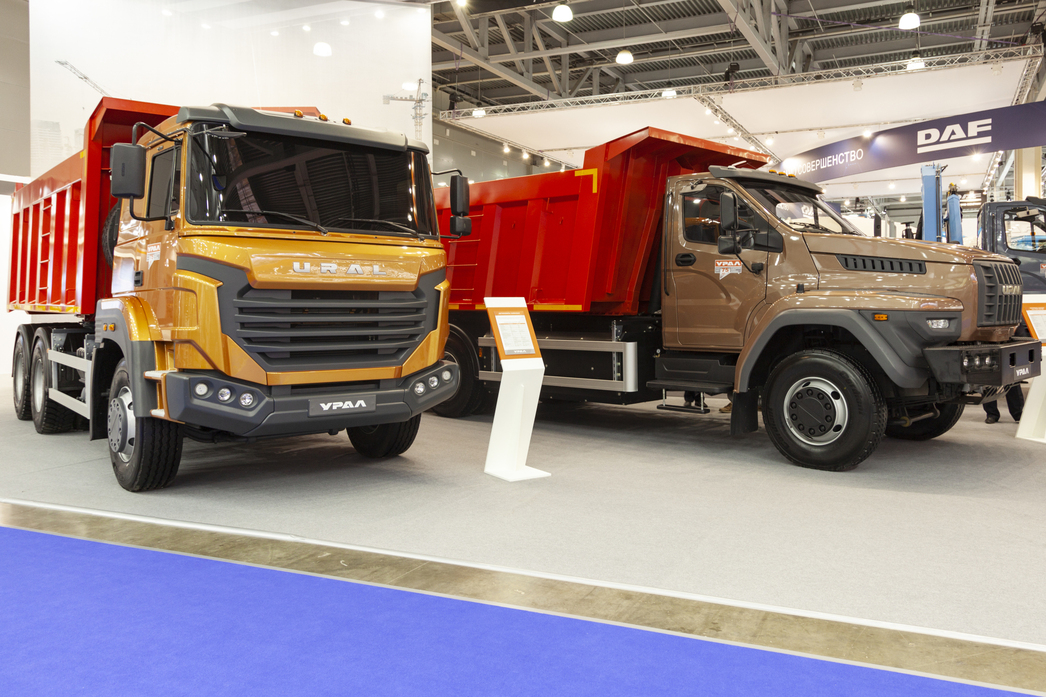 Грузовики из Миасса стоят отдельным стендом прямо напротив нижегородской техники. Главный экспонат, безусловно, дорожный самосвал 6х4 с бескапотной кабиной — такого мы еще не видели. Разговоры об этой машине шли давно, в Европе даже были замечены ходовые прототипы, но первая ласточка стоит на стенде «Комтранса».