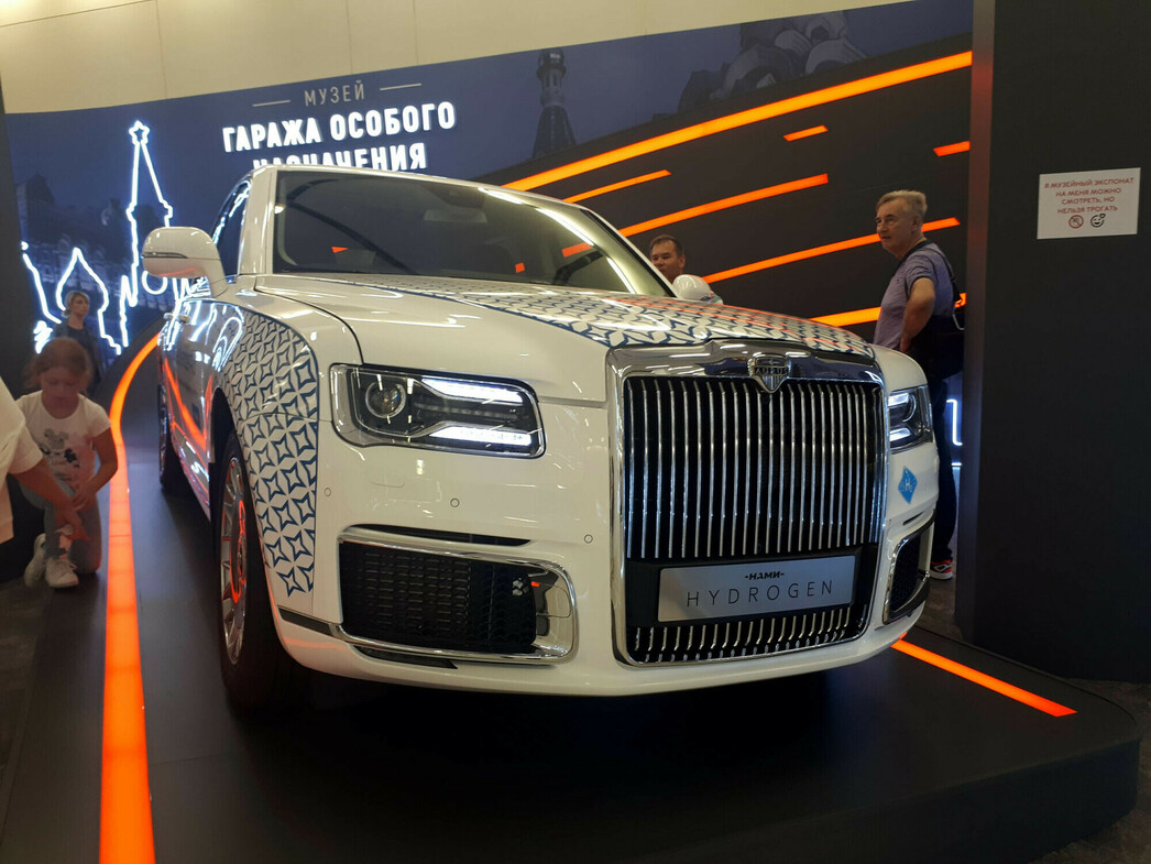 Рядом с «Москвичом» стоит премиальная инновация — Aurus Senat на водородных топливных элементах. Пока это только прототип, но надеемся, что серийная версия когда-нибудь увидит свет. Седан вызывает уважение, вот только под днищем заметны мощные стальные поперечины.