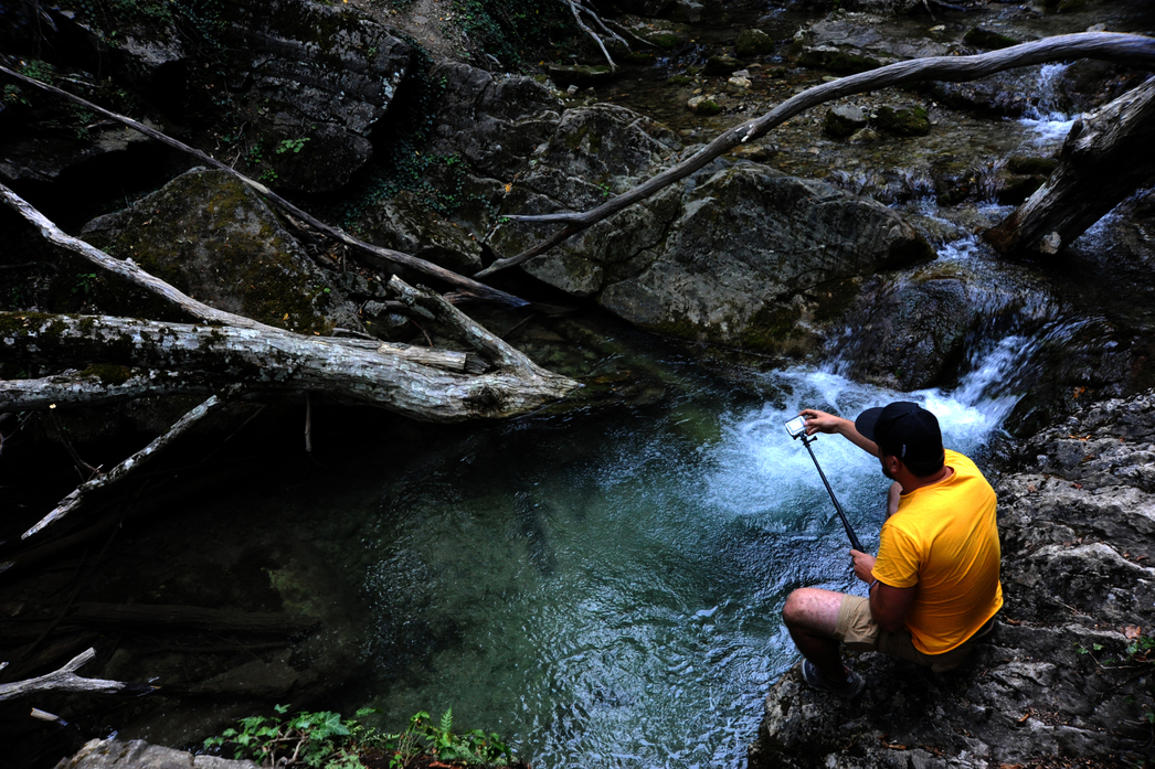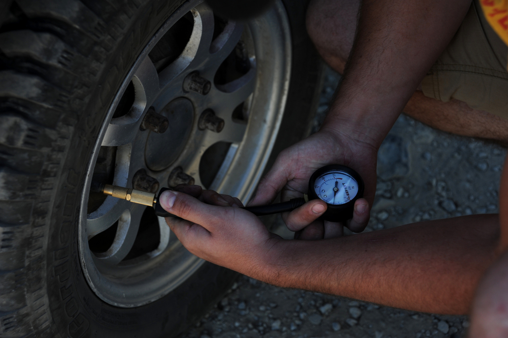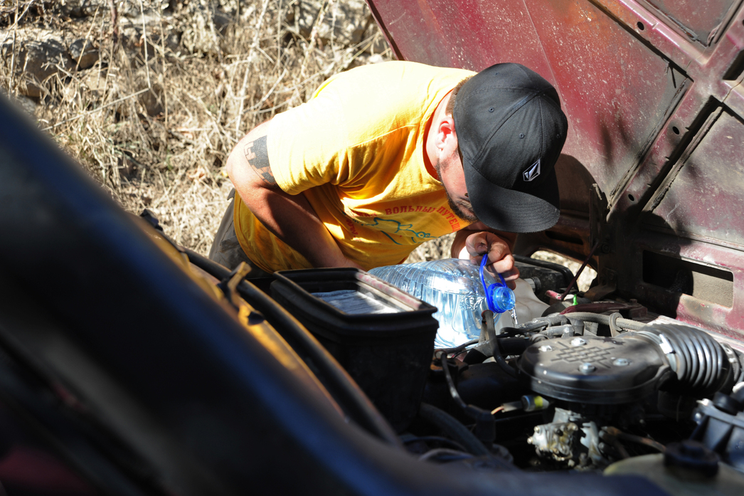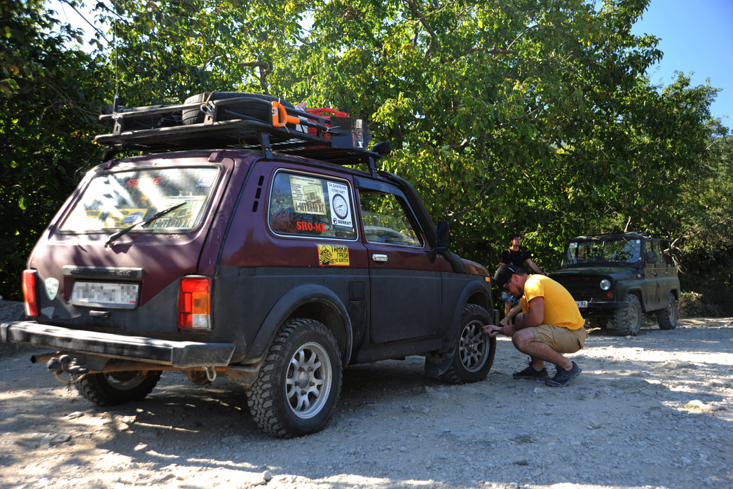 И тут случается маленькая неисправность: перегревается механический бензонасос и в нем образуется воздушная пробка — карбюраторные «Нивы» болеют этим недугом часто. Боремся с этой болезнью классическим путем, поливая насос из бутыли с водой. Заодно, бросив взгляд на каменистую дорогу, ведущую к цели, решаем в очередной раз стравить давление в колесах до 0,8 атм. И вот колеса стравлены, подача топлива восстановлена, мы углубляемся в хитросплетения грунтовок, ведущих к водопаду.