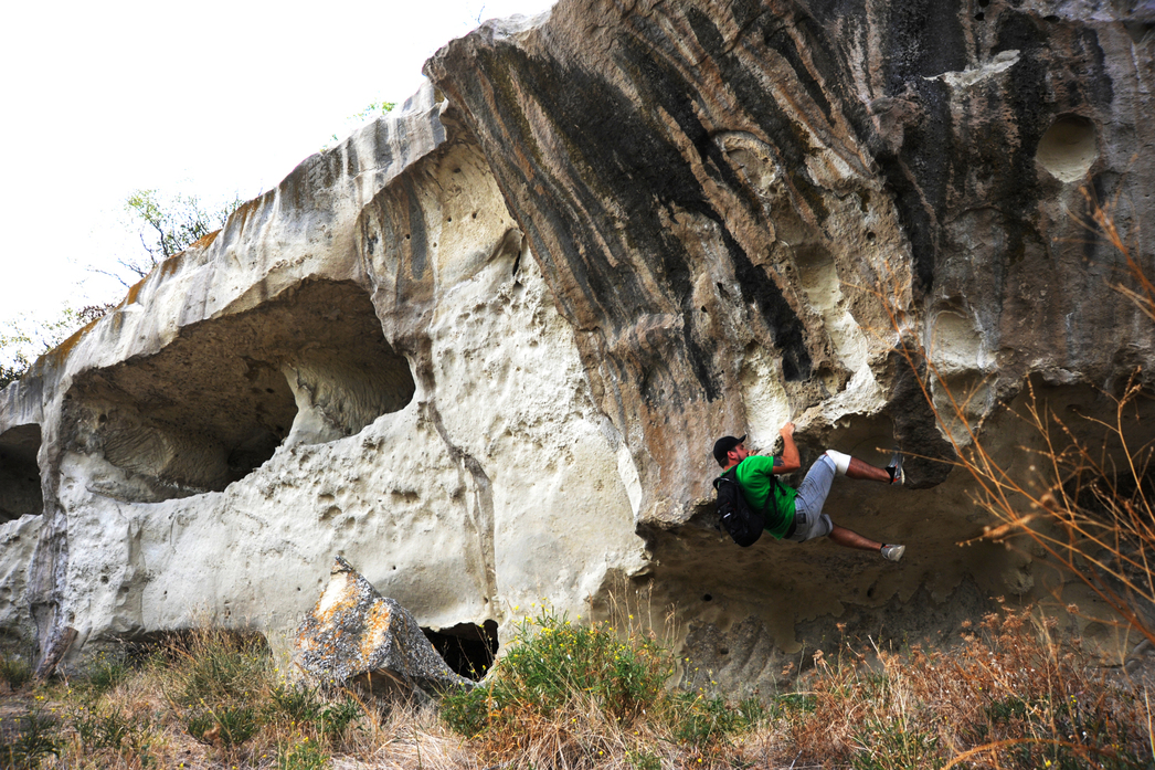 Перед нами открывается великолепный вид на гору и пещерный город, но неясно, как к нему подъехать — грунтовка разделяется на три направления сразу. Выбрав золотую середину, осторожно двинулись вперед. Как выяснилось, направление выбрали не то — дорога резко перешла в едва заметную в траве колею, которая, в свою очередь, закончилась довольно глубоким овражком. Но мы же на внедорожнике! Чуть не встав в распор, овражек проскочили! Оставив машину неподалеку от дороги, устремились на гору пешком. Город-крепость Тепе-Кермен поражает своими размерами — его площадь около 1 гектара и находится он на высоте 340 метров относительно дороги. Вся вершина горы изрыта пещерами, стены которых носят следы древних орнаментов. Поскольку туристы тут бывают редко, город чистенький, без надписей типа «Здесь были Ося и Киса». С вершины горы открывается вид на еще один пещерный город, каньон и заброшенную по виду военную базу, незаметно примостившуюся в ущелье. В некоторые пещеры приходилось залезать, карабкаясь по скале.