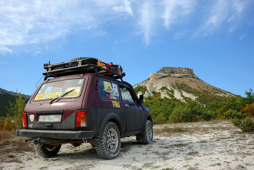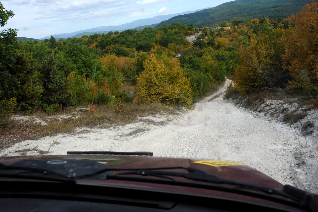 Дальнейшая дорога далась легко и через полчаса мы проехали Бахчисарай и углубились в северную часть Большого Крымского Каньона, от пещерного города Тепе-Кермен нас отделяло всего пять километров. Сворачиваем на белую грунтовку под почти не читаемым указателем, и почти сразу она превращается в полосу препятствий, состоящую из глубоких ям и буераков. Включаем «понижайку» и аккуратненько проходим все преграды.