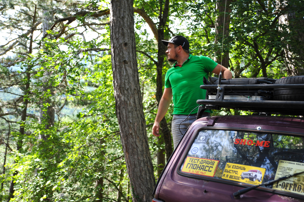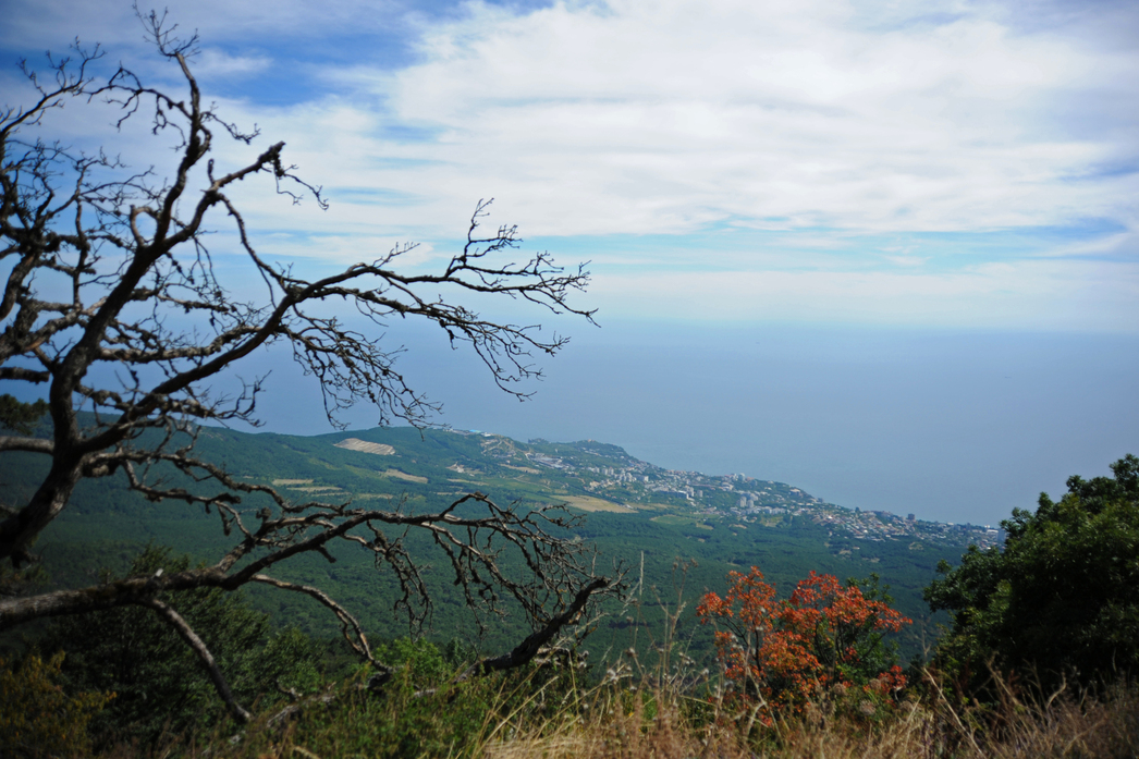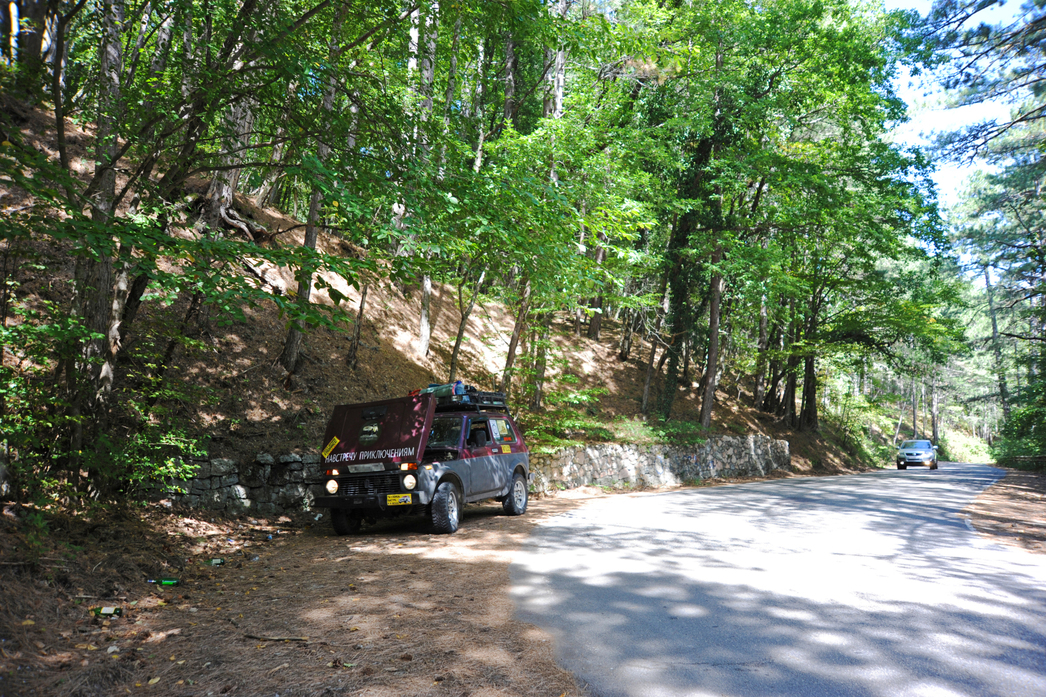 Тем временем извилистое шоссе неуклонно вело нас к цели. Сразу за Ялтой увидели на обочине плакат с объявлением, что старое Бахчисарайское шоссе перекрыто в связи с оползнем. Правда, какой-то неизвестный художник оставил на плакате свою подпись баллончиком черной краски, из чего мы сделали вывод, что плакат довольно старый — не может же там быть вечный оползень… На повороте опять плакат. Мы и его стойко игнорируем и углубляемся в извилистый серпантин горной дороги. Ох, я и не думал, что он настолько извилистый — через полчаса мы поднялись всего на триста метров, бесконечные повороты не давали шанса разогнаться хотя бы до 30 км/ч. Единственное, что радовало несказанно — это почти полное отсутствие машин, невероятно живописные виды и множество родников, источников и даже водопадов по пути. К одному из родников мы свернули и набрали вкуснейшей воды, от которой ломило зубы, но хотелось ее пить и пить. И вот мы на перевале, с которого открывается невероятно живописный вид, а ноздри теребит запах шашлыка и плова, готовящихся в палатках местных торговцев. Сделав пару фотографий, помчались дальше.