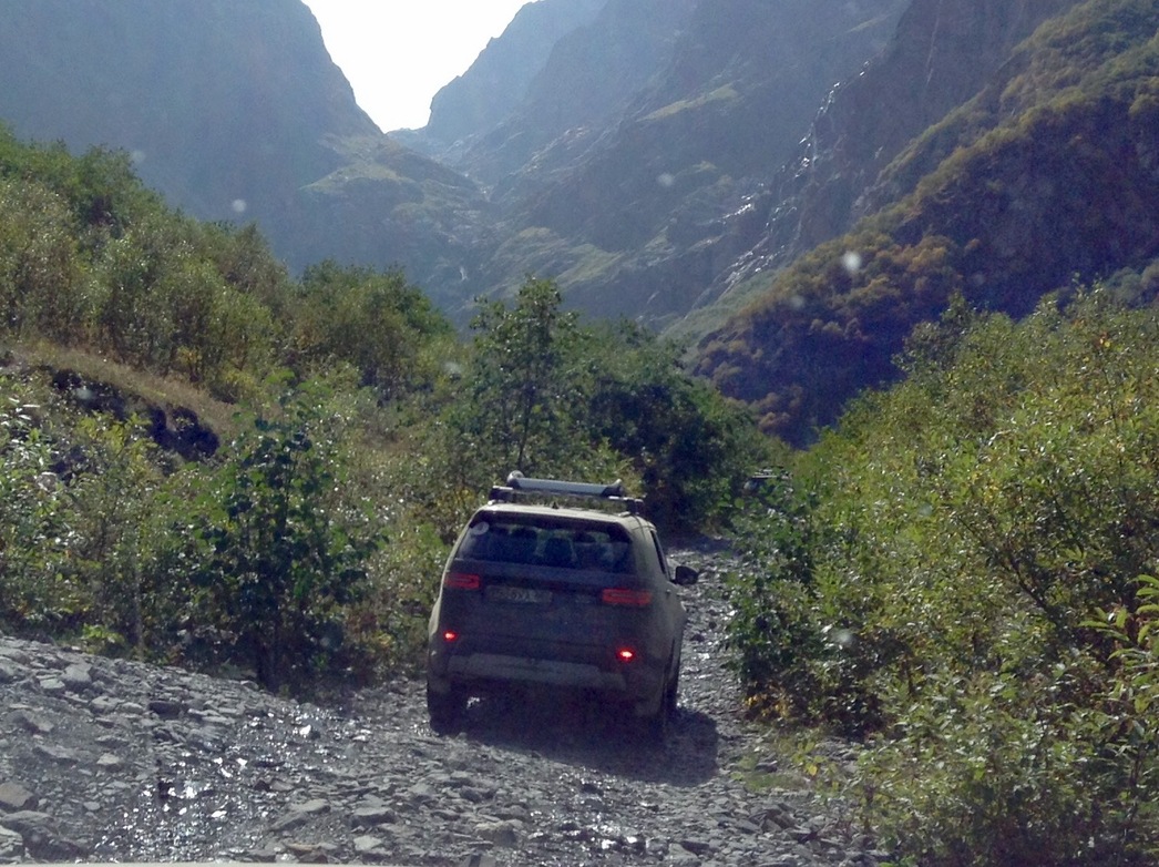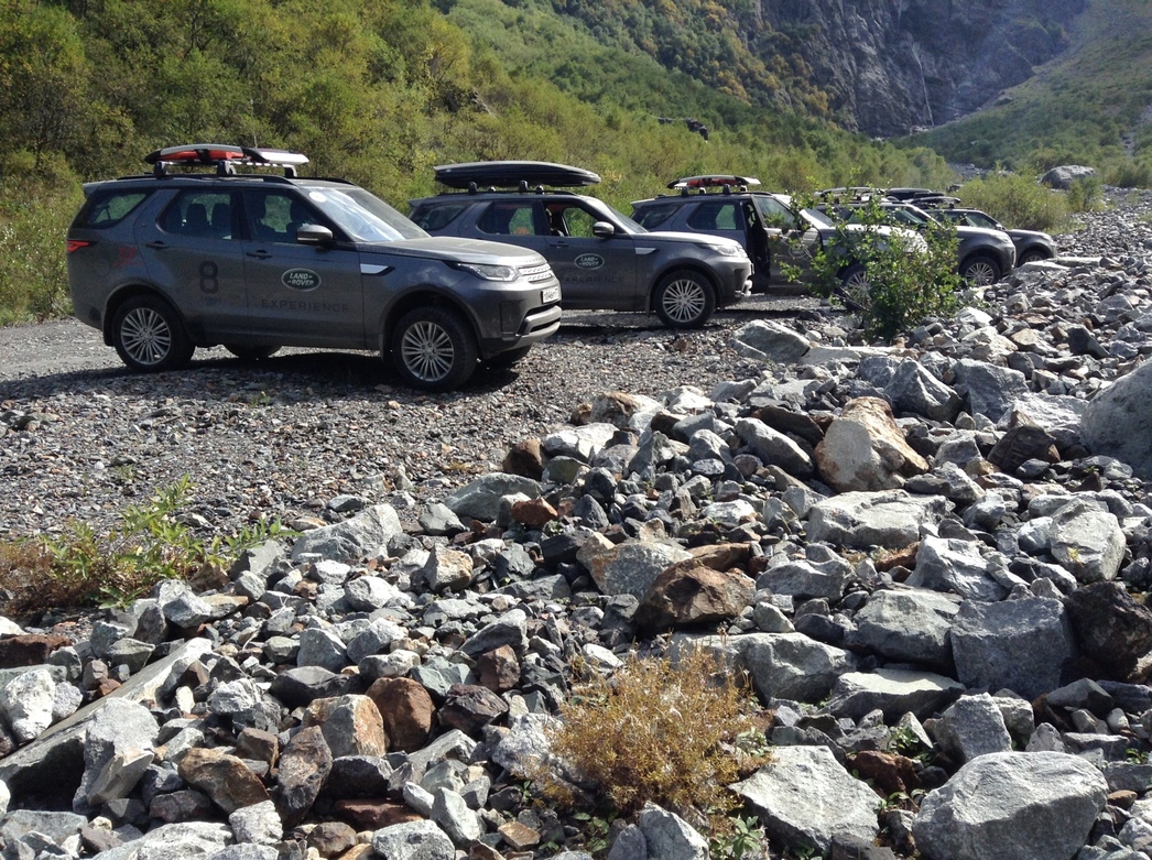 Глубина преодолеваемого брода у нового Discovery 5 увеличилась на 200 мм — до 900 мм, но в любом случае «утонуть» в ручье нам не грозило. А вот благодаря пониженной передаче и фирменной системе контролируемого движения под уклон HDC, которая включалась автоматически при съезде с горок, внедорожник сохранял траекторию движения, и его не сносило в юз на скользких камнях. Причём Disco уверенно двигался и без использования режима «Камни» системы Terrian Responce.