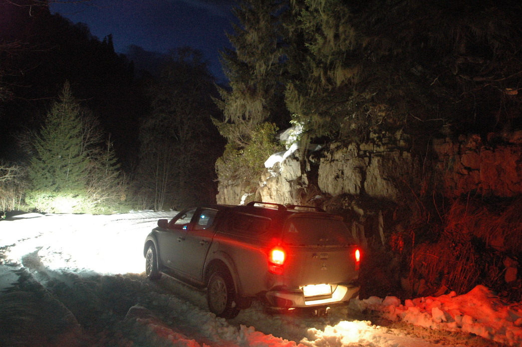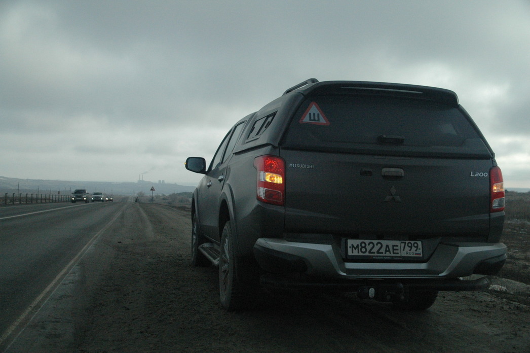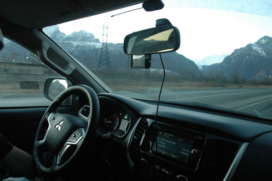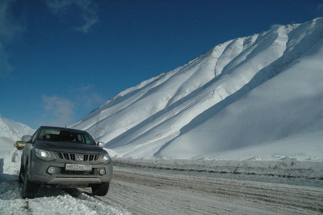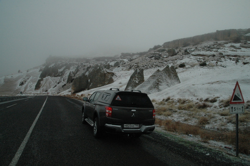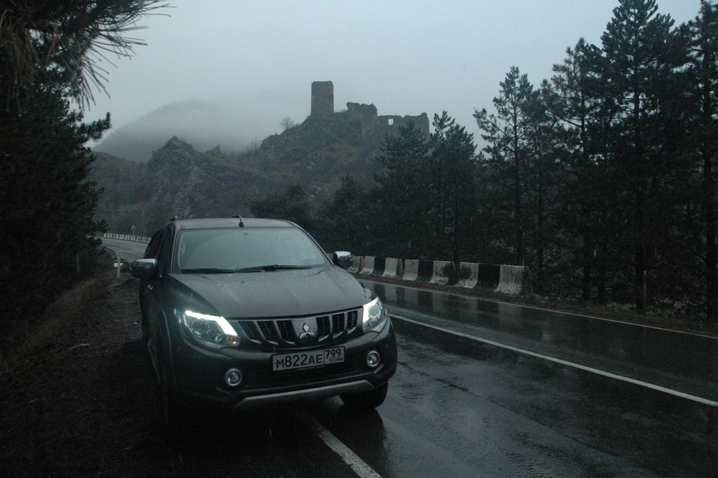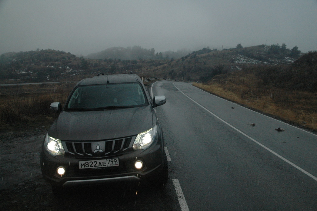 Увы, короткая дорога не всегда оказывается быстрой — перевал, через который проложил дорогу навигатор, сначала насторожил низким трафиком, затем окончившимся асфальтом, крупными, совсем недавно упавшими на дорогу камнями и снегом. Сначала не сильным, а затем таким, что пришлось задействовать весь внедорожный потенциал нашего L200, включив понижайку и заднюю блокировку. И снова повезло — уперлись в буксовавший ГАЗ-63, люди из которого поведали, что дальше снега лишь больше и проехать тут нельзя. Пришлось развернуться и, сделав крюк в 200 километров, вернуться на скоростное шоссе, поехав длинной, но верной дорогой.
