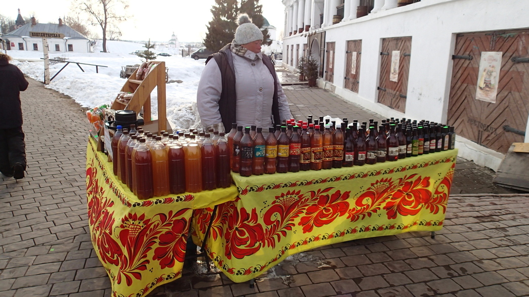 В центре города на главной площади развернута бойкая торговля различными сувенирами, народными игрушками, одеждой, разнообразной снедью и, конечно, знаменитым суздальским сбитнем и медовухой. В основном предлагается фабричный продукт великолепного качества самых разных сортов и разновидностей по средней цене 200 рублей за полтора литра. Но можно выбрать и домашние хмельные напитки — в среднем 300 рублей за полтора литра.