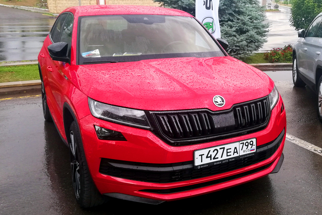 А тем временем около входа в парк нас ждет новый Kodiaq в версии Sportline. Автомобиль ярко-красного цвета однозначно притягивает взгляды. А уж благодаря накладкам a-la спорт на порогах и бамперах, 20-дюймовому литью (в базе, правда, идут 19-дюймовые «тапочки»), этот паркетник и впрямь выглядит как натуральный спорткар. Изюминке облику придает и контрастный окрас некоторых элементов кузова. Так, например, накладки на переднем бампере, радиаторная решётка, корпуса наружных зеркал и окантовка боковых стёкол окрашены в чёрный цвет. Посмотрите на фоторграфии. Круто же смотрится, не правда ли?