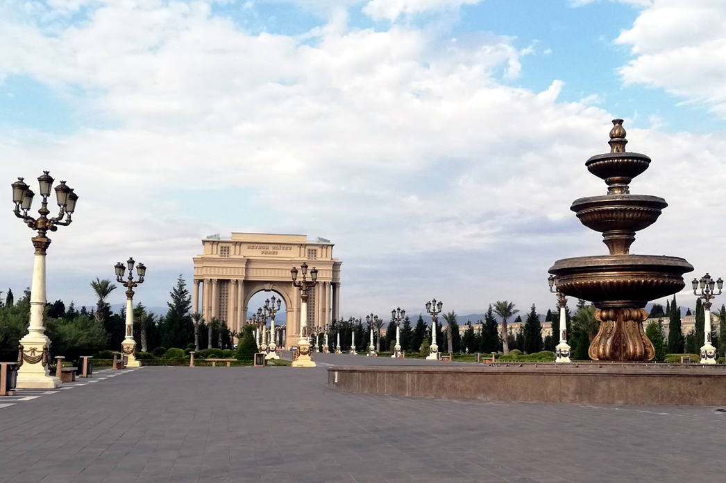 Старт я взял в городе Гянджа. Пожалуй, главной достопримечательностью этого поселения можно назвать Парк имени Гейдара Алиева. Роскошный сад, с огромными пальмами, дивными фонтанами, цветущими едва ли не всеми цветами радуги розами на клумбах. Размах и величие, с которым там все сделано, поистине поражает. Разумеется, в центральной части парка стоит исполинских размеров памятник национальному лидеру, в честь которого и построен этот оазис.