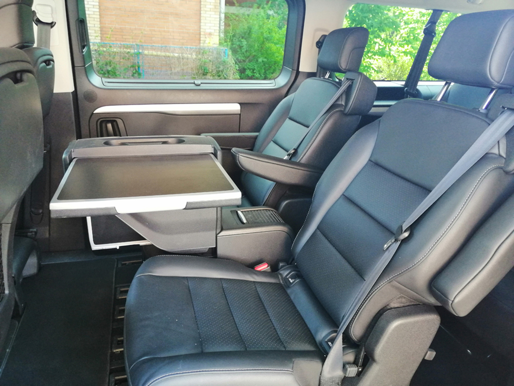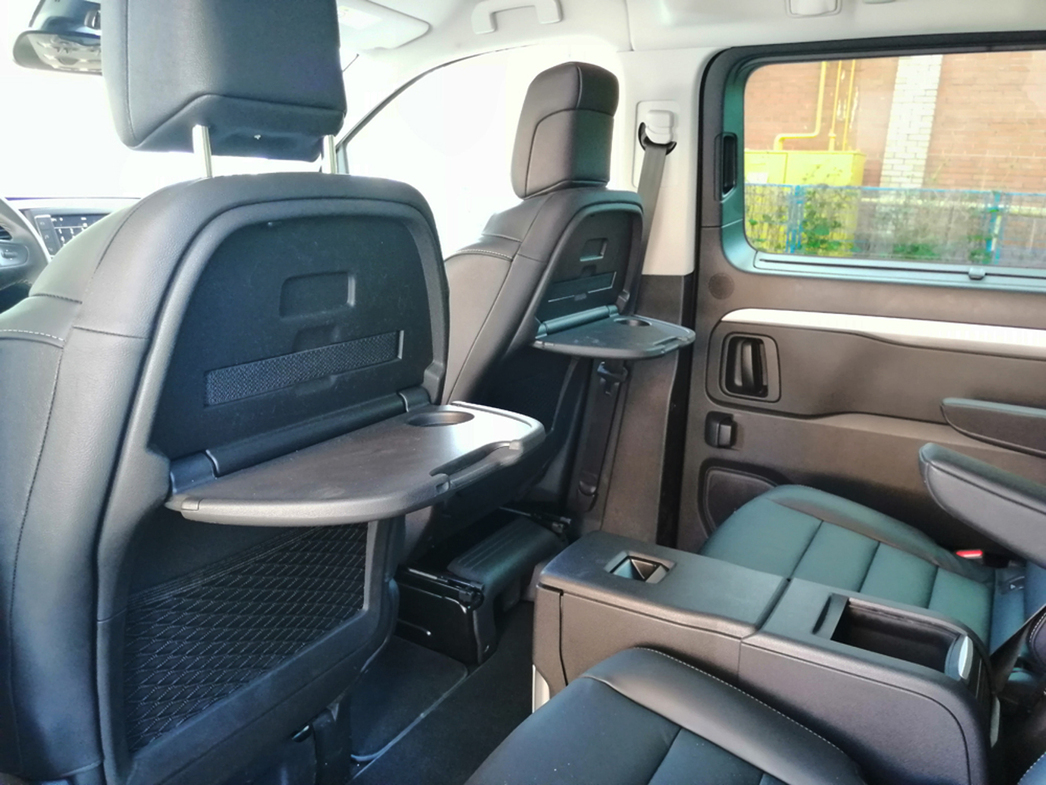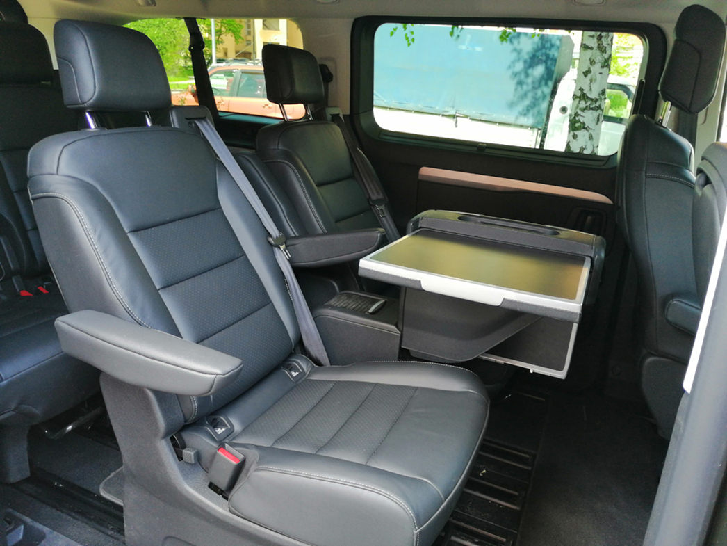 Кроме того, для пассажиров здесь предусмотрены пара сдвижных дверей с электроприводом с обеих бортов, розетки, вентиляция с печкой и подстаканники, складной передвижной стол в центре салона с широким диапазоном трансформации. Кресла второго ряда можно развернуть на 180 градусов — лицом к пассажирам на галерке.