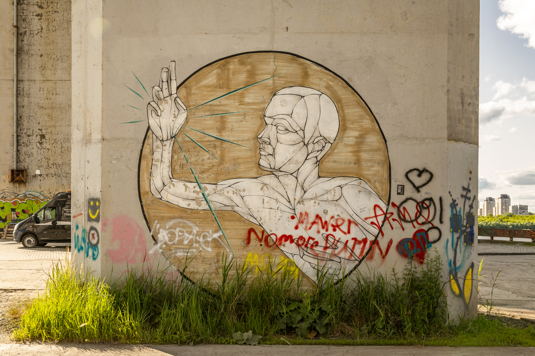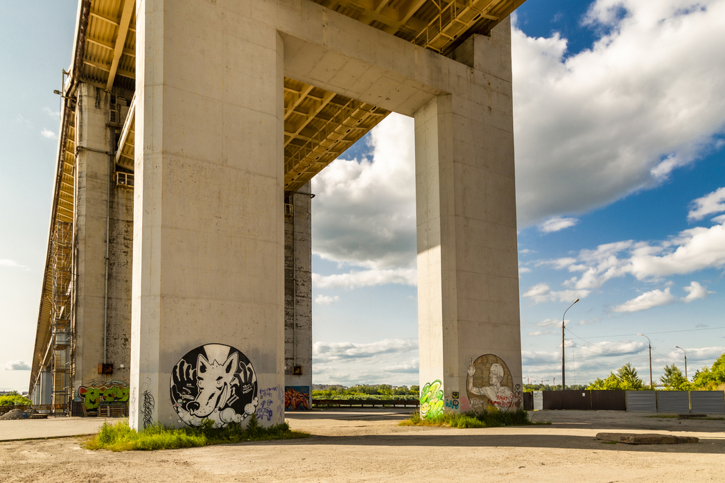 Далее начинаем возвращаться к метромосту, по дороге разглядывая работу Ивана Серого и Егора Той. Сам метромост, вернее, его основание — одно из наиболее известных «собраний» городского граффити: от каллиграфии до итерации наказания для тех, кто спит на краю. Отдельное внимание — Алексею LexuOne и его «Гуляй, дядя». Очень!