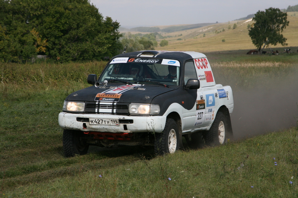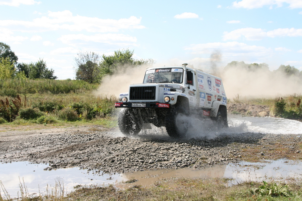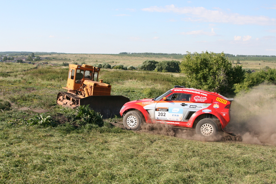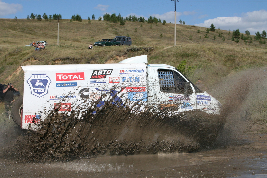 Настолько неприятных, что гонщикам не пришлось любоваться пасторальными пейзажами. Да и журналистам это удалось сделать по минимуму – с виду «утоптанная» грунтовка готовила командам всевозможные сюрпризы. Например, узкие дорожки на лесных участках, неожиданные ямы по краям, а то и посередине дороги. Если водитель пресс–кара на скорости 40-60 км их еще может заметить, то гонщик на «сотне» – вряд ли. Остается надеяться только на своевременные команды штурмана. Мало того, зачастую дорожные изъяны были тщательно замаскированы травой и кустарником, но обозначались в роудбуке, как «яма 2». Плюс к этому более банальные сюрпризы: неожиданные спуски, подъемы и резкие повороты. Кстати, на одном из них коварными организаторами был установлен бульдозер, а слева от него проходил пересохший оросительный канал. Для мотоциклистов этот узкий коридорчик не стал препятствием, а вот для несущегося на полной скорости гоночного грузовика... Для полного антуража, напротив бульдозера живописно «расположили» развалины церкви. Мы не удержались, и сфотографировали наш полноприводный «Соболь» на фоне одной из них. На маршруте гонок находилось и несколько бродов, которые так же дарили любопытные кадры. Особенно, когда их проходил гоночный грузовик. Здесь поневоле понимаешь, почему ульяновская трасса, наряду с Калмыкией и Астраханской областью, прочно обосновалась в календаре российских ралли-рейдов.