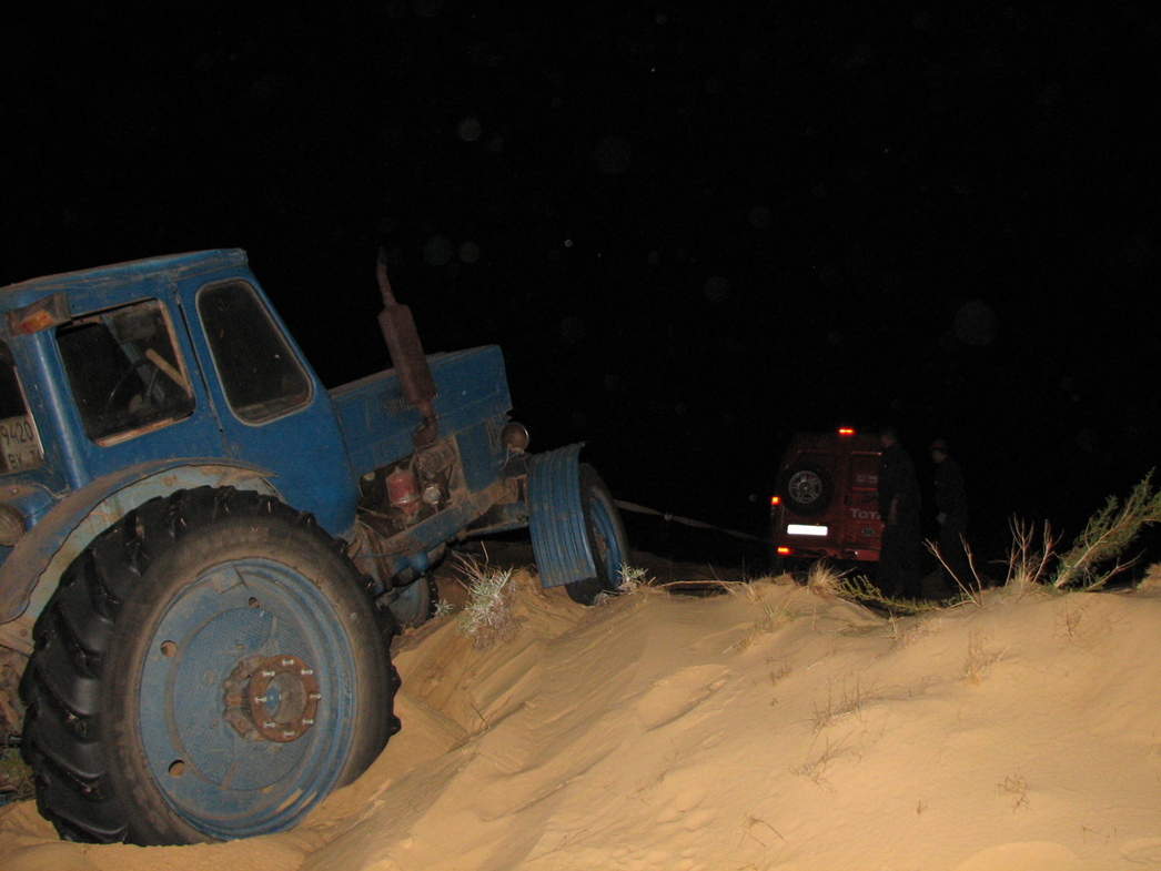 И вот из темноты показалось чудовище, сверкающее единственным глазом и утробно урчащее. Это прибыл на выручку и одновременно подкалымить трактор МТЗ-50. Эх, зря мы доверились вылезшему из него аборигену. Тот заявил, что в сторону асфальта мы не проедем, слишком коварные пески, и лучше тащить поверженный болид в другую сторону, к его родной деревне. Дескать, по пескам придется пройти чуть больше километра, а далее начинается нормальная грунтовка. Как же... Наши перемещения в пространстве выглядели следующим образом: мы откапываем недвижимые передние колеса, трактор делает рывок и приподнимается на дыбы, вскидывая к звездному небу маленькие передние колесики. Мы продвигаемся на несколько метров и вновь беремся за лопаты. Так продолжается почти полкилометра, когда на суфийского ученика Марину нисходит главное откровение: «Я поняла, на ралли-рейдах главное – лопата!». До остальных участников доходит другая истина – абориген заблудился в родных песках и мы копаем совсем не в ту сторону. Точнее, накручиваем круги между барханами. И вот настал момент, когда пришло главное откровение это ночи: оставить гоночный аппарат, вынув из него все ценное, и ехать на базу. Завтра его заберет более серьезная техника.