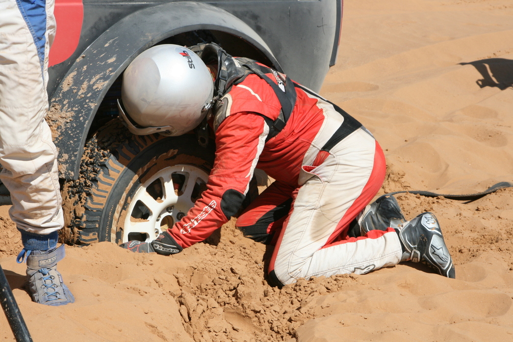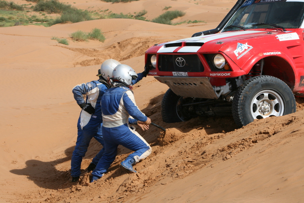 Начать следует с давнего противостояния прибалтов и команды «ГАЗ Рейд Спорт». На прошлом этапе в степях Казахстана экипаж последних стал первым в категории. И здесь поневоле возникает ощущение, что соперники решили взять золото не самым честным путем. Судите сами: в категории серийных внедорожников Т2 ехали еще два экипажа AVMotorsports. Экипажи этой категории выходят на старт раньше более быстрых рейдовых аппаратов. В одном из них штурманом был брат Алдиса — Марис. Тот пропустил брата вперед, а как только появились газовские конкуренты, врубил «Аларм» на навигационном приборе. Дескать, у меня что-то там случилось, и не трогайте меня! При этом автомобиль двигался в том же темпе, не давая на узкой гоночной колее проехать двум подоспевшим газовским экипажам и еще одному конкуренту Вилцанса — экипажу Максима Кирпилева.