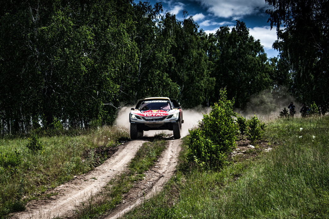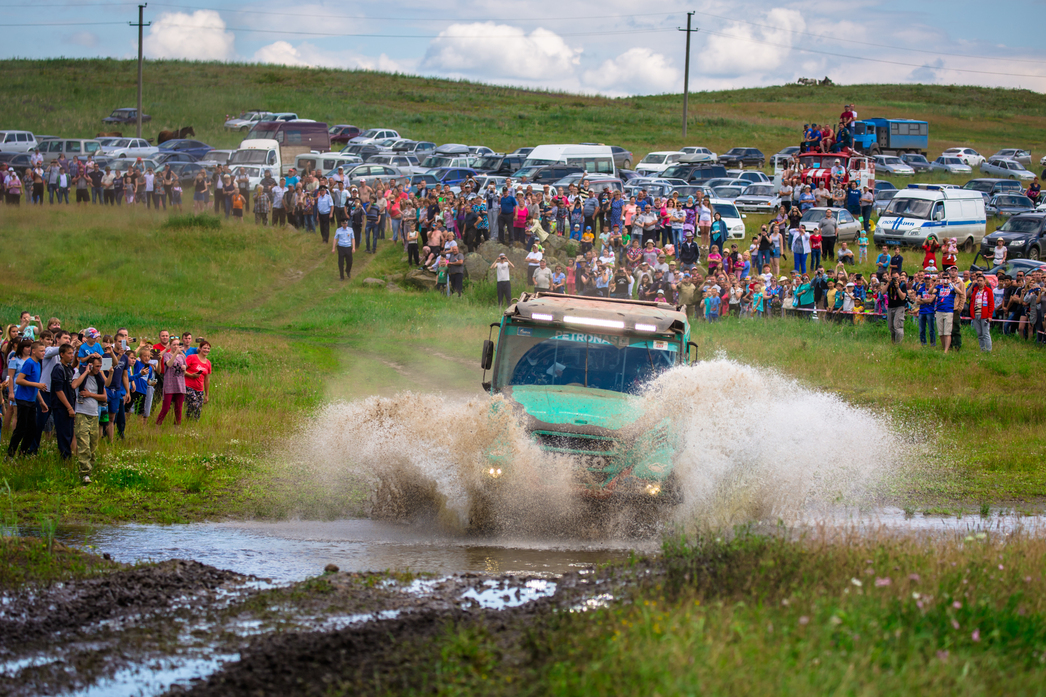 Второй день был намного суше предыдущего — всего лишь несколько бродов на зрительских точках. В Челябинской области началась классическая степь, как бы прелюдия к покорению Казахстана. Высокая трава, неожиданные ямы и валуны (отличительная черта этих мест), коварная схема степных дорог и как следствие — частая смена направления гоночного маршрута. Именно поэтому француз Сириль Депре на 8-й минуте гонки застрял в канаве и отстал от коллег по Peugeot.
