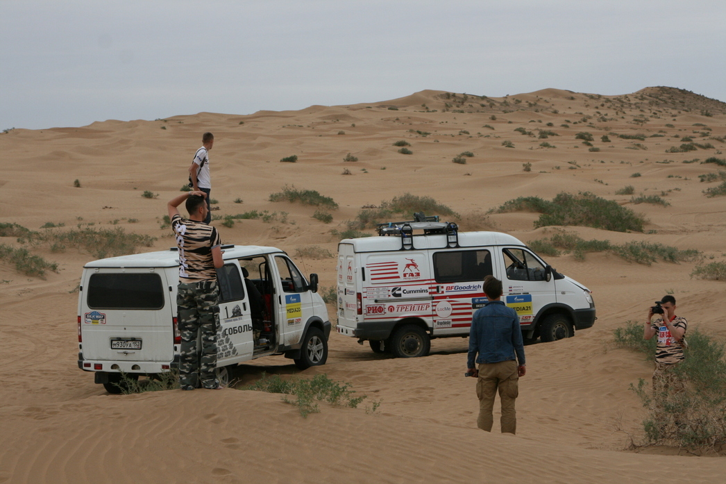 Перед марафоном мне приходилось слышать от гонщиков о коварстве этой пустыни и ожидаемых трудностях. Особенно от тех, кто прошел ее в прошлом году. Однако тут меня ждало разочарование — ничего особенного я так и не увидел — все в рамках обычного затяжного марафона. Наш «Соболь 4х4» спокойно его прошел, как будто это была сильно растянутый ралли-рейд по Калмыкии. Те самые знаменитые высоченные песчаные дюны мы спокойно преодолели. Да, приходилось несколько раз работать лопатой, спускать колеса и жариться на беспощадном солнце — средняя дневная температура была около 45 градусов.