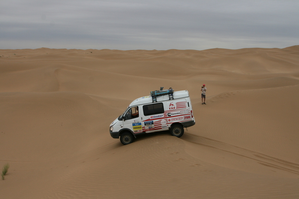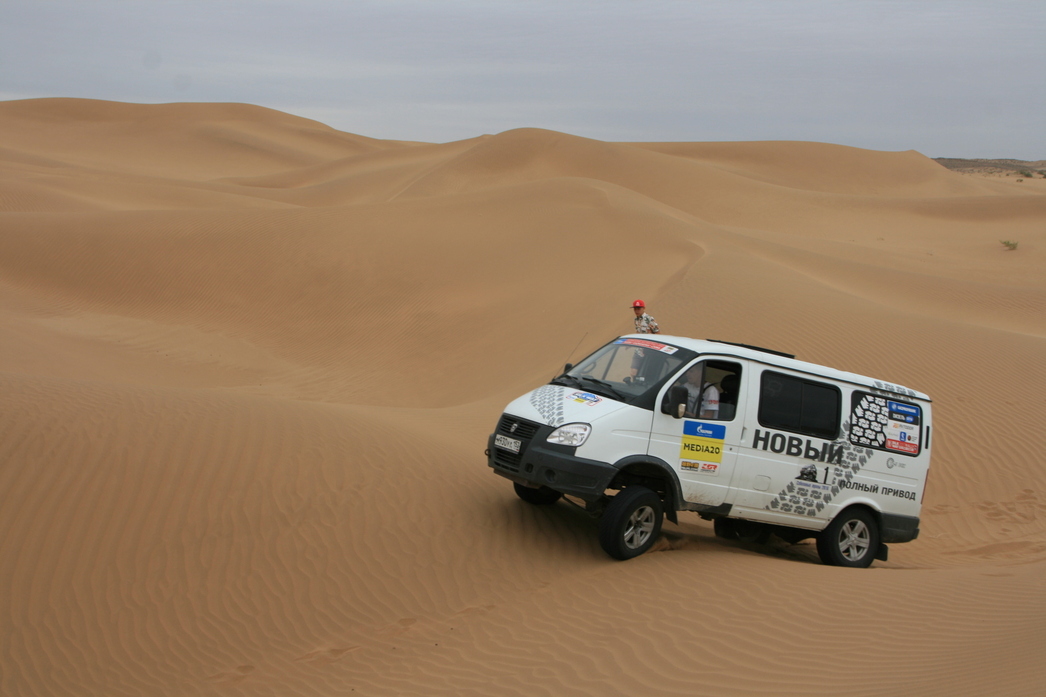 Определив ближайший маршрут, нужно четко понимать, что мелкие дюны можно штурмовать в лоб, а вот большие (и вообще все, которые вызывают сомнения) объезжать по ложбинкам или по кругу. Последнее также вызывает изысканные ощущения: «Соболь» все-таки высокий микроавтобус, и постоянно кажется, что он в любой момент ляжет на бок. В любом случае приходится искать более пологий склон. Который, увы, часто заканчивает резким обрывом, когда машина взлетает как с трамплина. Тормозить нельзя — можно капитально «сесть на брюхо» на вершине барханчика. При этом надо всегда прикидывать дальнейший маршрут и делать это максимально оперативно. Огромные песчаные воронки — нормальное явление и избежать их не получится. Выбираться из них так же, как и штурмовать бархан — «спиралью» по краю. Со стороны это напоминает цирковых мотоциклистов в огромном шаре. Иногда это удается с третьей и даже пятой попытки. Главное — не останавливаться, а то закопаешься.